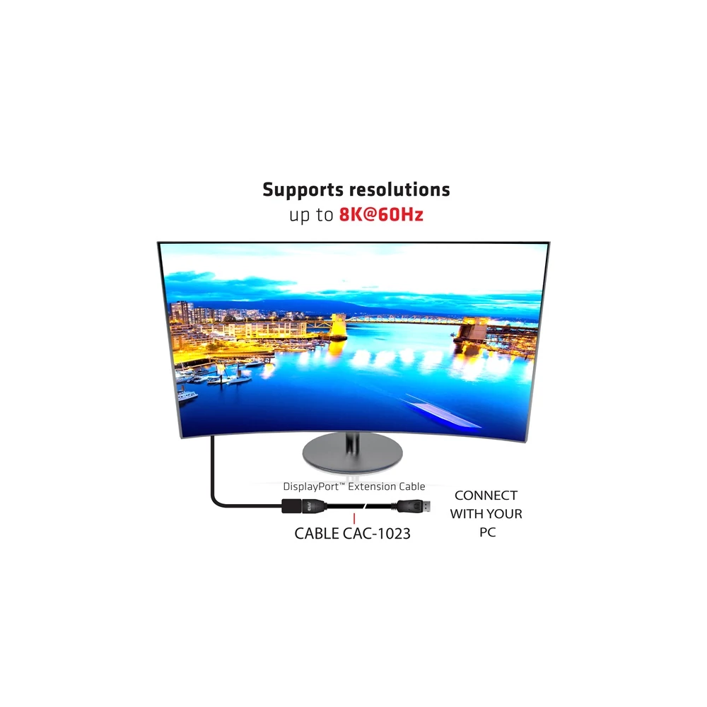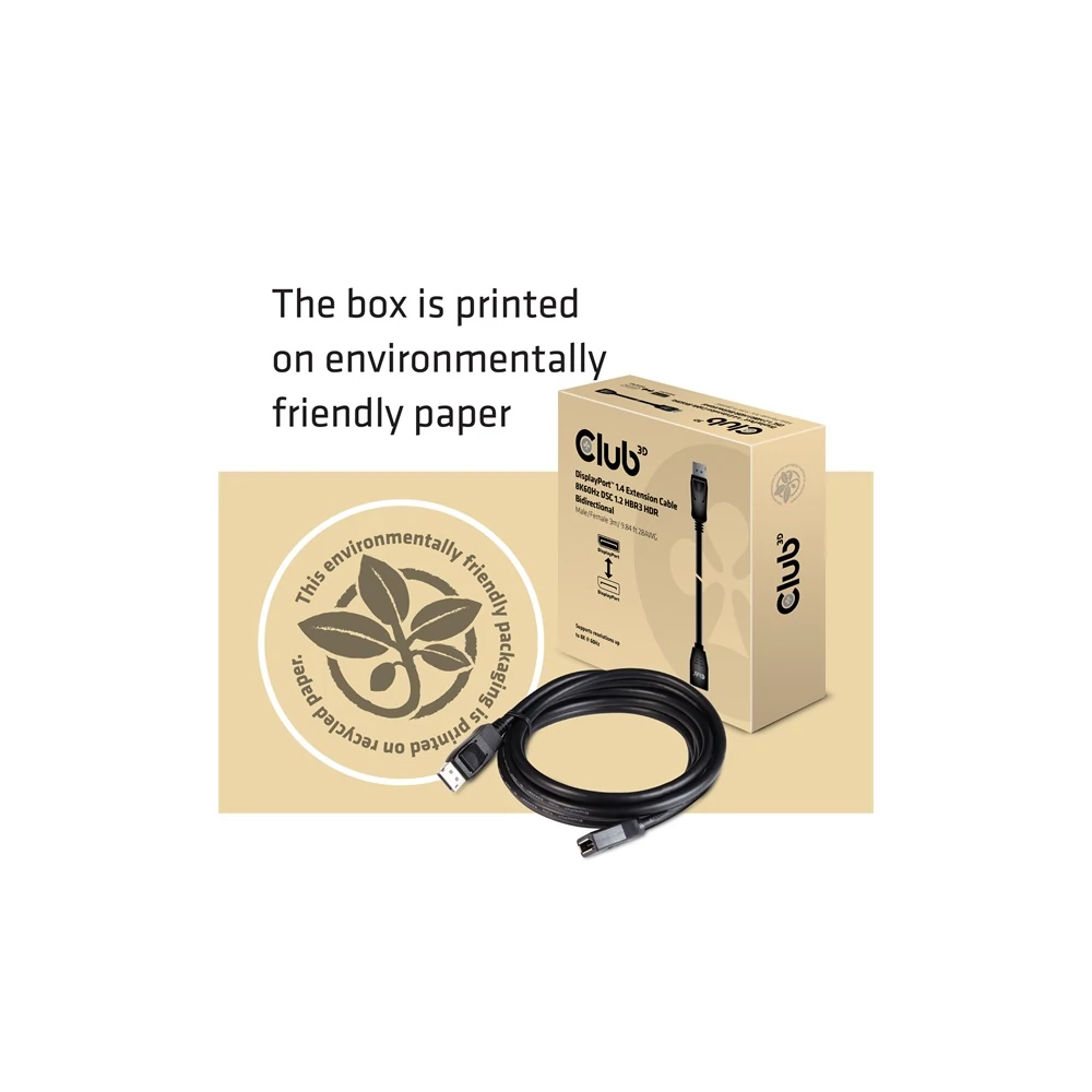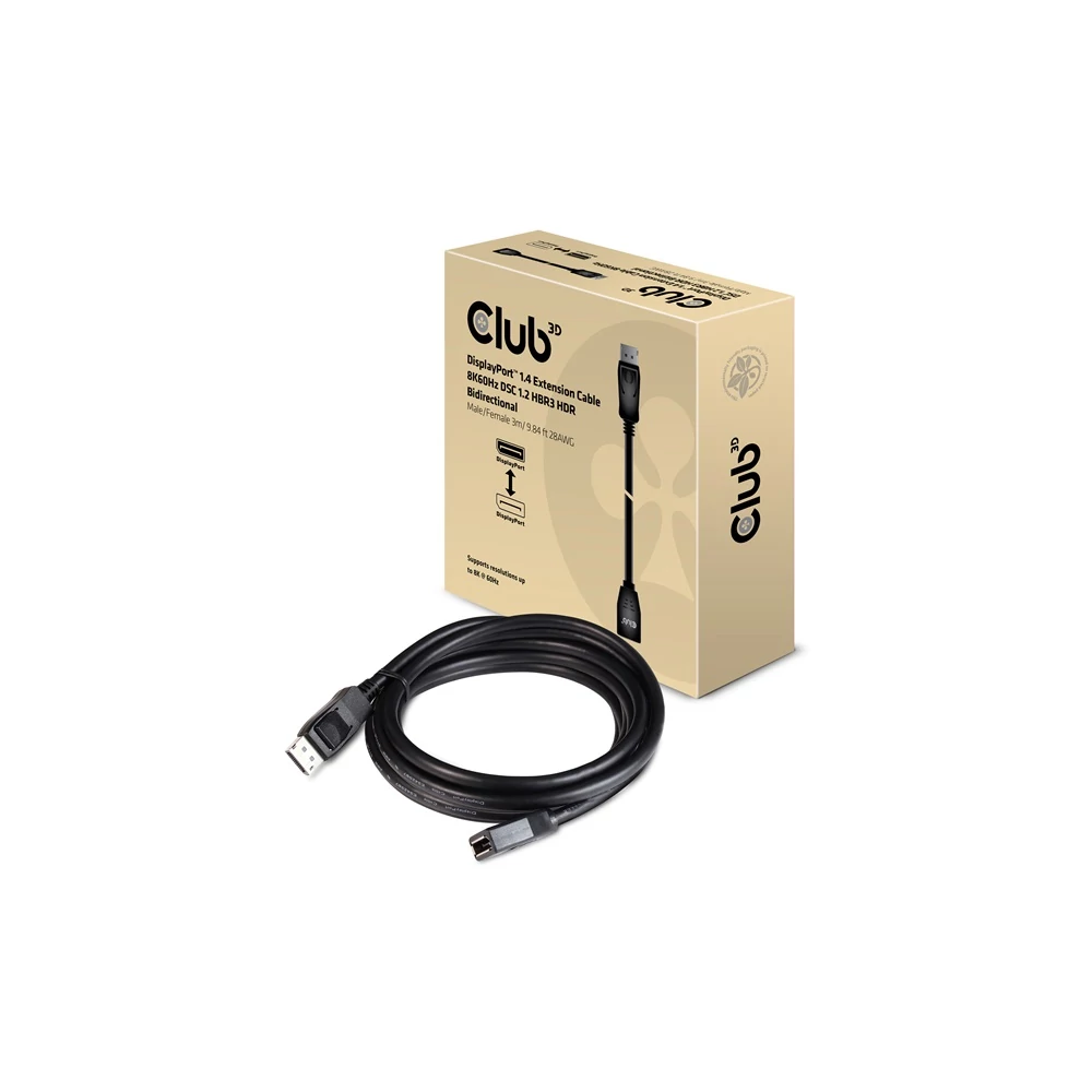 CAC-1023 – A Club 3D DisplayPort™ 1.4 hosszabbítókábel 8K60Hz DSC 1.2 HBR3 HDR kétirányú dugasz/nő 3 m/ 9.84 láb 28AWG kábel lehetővé teszi a kapcsolat meghosszabbítását a DisplayPort™-támogatott (játék) PC-vel vagy laptoppal egy másik nagy felbontású DisplayPort™-eszközzel. A DisplayPort™ 1.4 támogatja a Display Stream Compression 1.2-t (DSC), a Forward Error Correction-t, és 32-re növeli a beépített audiocsatornák maximális számát.