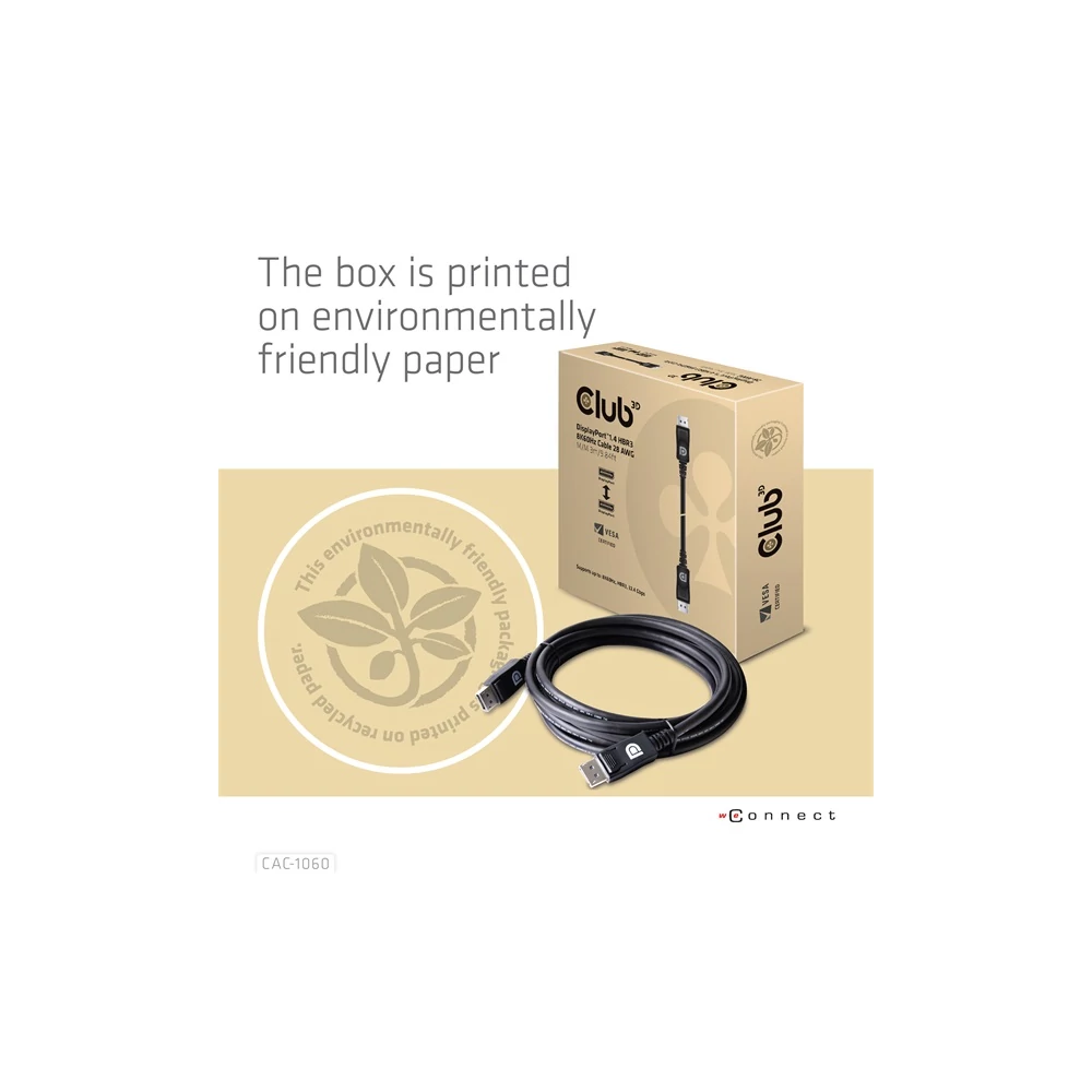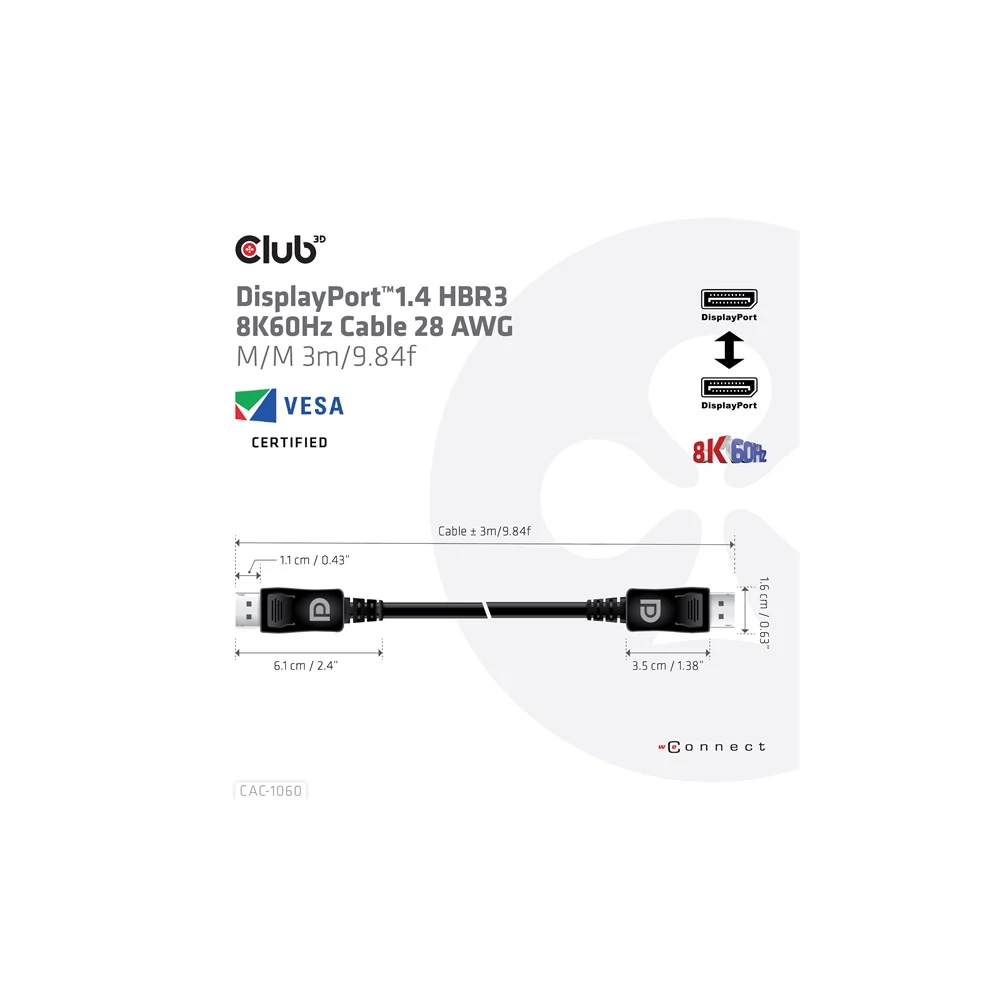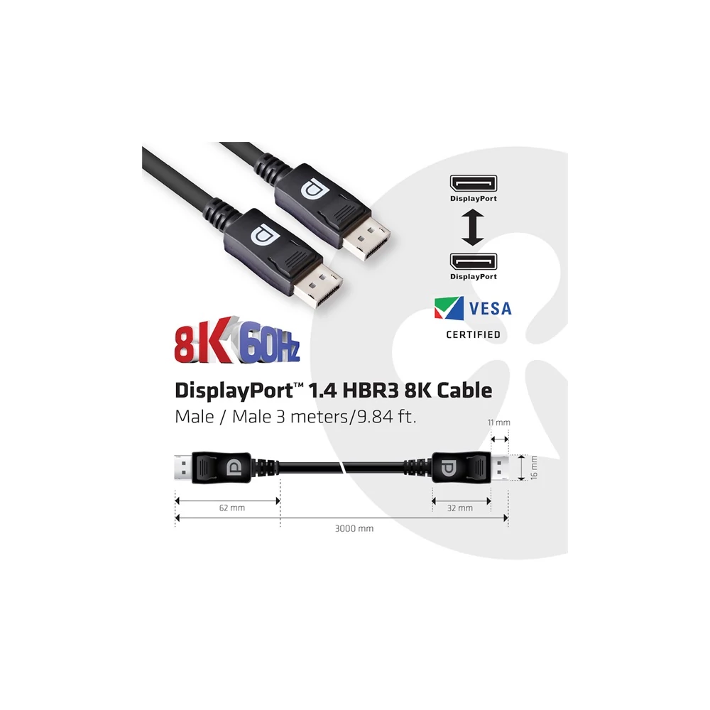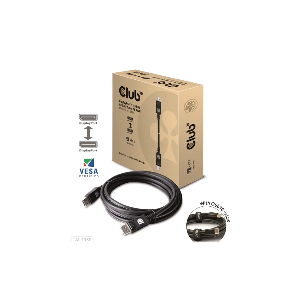 A Club 3D DisplayPort™ 1.4 HBR3 8K kábel lehetővé teszi a DisplayPort™-ot támogató (játékos) PC vagy laptop csatlakoztatását egy (Ultra) Nagy Felbontású Monitorhoz vagy más DisplayPort™-ot támogató eszközhöz. A DisplayPort™ 1.4 támogatja a Display Stream Compression 1.2 (DSC), a Hibajavító Kódok (FEC), valamint növeli a maximális fenn álló audió csatornák számát 32-re. Zárható DisplayPort™ csatlakozókkal rendelkezik, amelyek biztonságos, megbízható kapcsolatot biztosítanak. Egyszerűen csak nyomja meg a beépített egyérintős zárgombot a csatlakozó kioldásához. A puha UltraFlex köpeny megvédi a kábelt az ívek és deformációk okozta sérülésektől. Specifikációk: • Teljes mértékben megfelel a DisplayPort™ 1.4 szabványnak, HBR3, 32.4Gbps, 28AWG • Támogatja a Display Stream Compression (DSC) 1.2-t • Támogatja a Hibajavító Kódokat (FEC) • Akár 32 hangcsatorna támogatása • Visszafelé kompatibilis a régebbi DisplayPort szabványokkal • Akár 8K @ 60Hz és 4K @ 144Hz felbontás támogatása • DSC1.2 nélkül a maximális támogatott felbontás: 5K @ 60Hz • Vesa tanúsítvánnyal rendelkezik Operációs rendszer támogatás: Minden Bemenet: DisplayPort™ 1.4 Male Kimenet: DisplayPort™ 1.4 Male További információ: • Doboz mérete: 210 x 210 x 50 mm • Doboz súlya: 64 gr • Termék súlya: 219 gr • Termék súlya kiskereskedelmi dobozban: 283 gr • Termék magassága: 12 mm • Termék szélessége: 19 mm • Termék hossza: 3 méter / 9.84 láb • Megfelel a ROHS, FCC és CE EMI követelményeinek • Kínában készült A csomag tartalma: Club 3D DisplayPort™ 1.4 HBR3 8K Kábel Gyártói termékoldal
