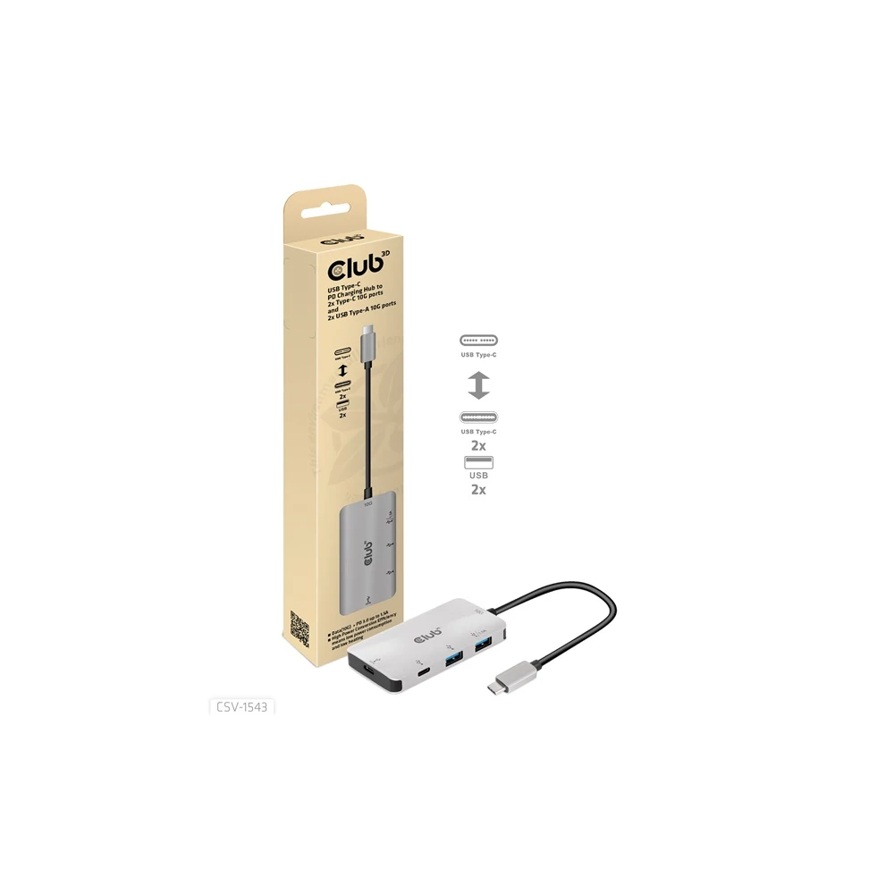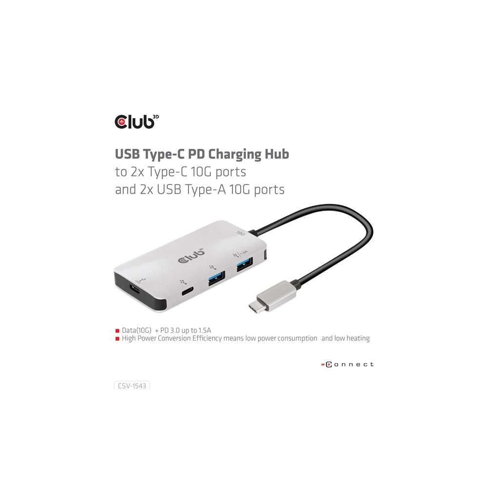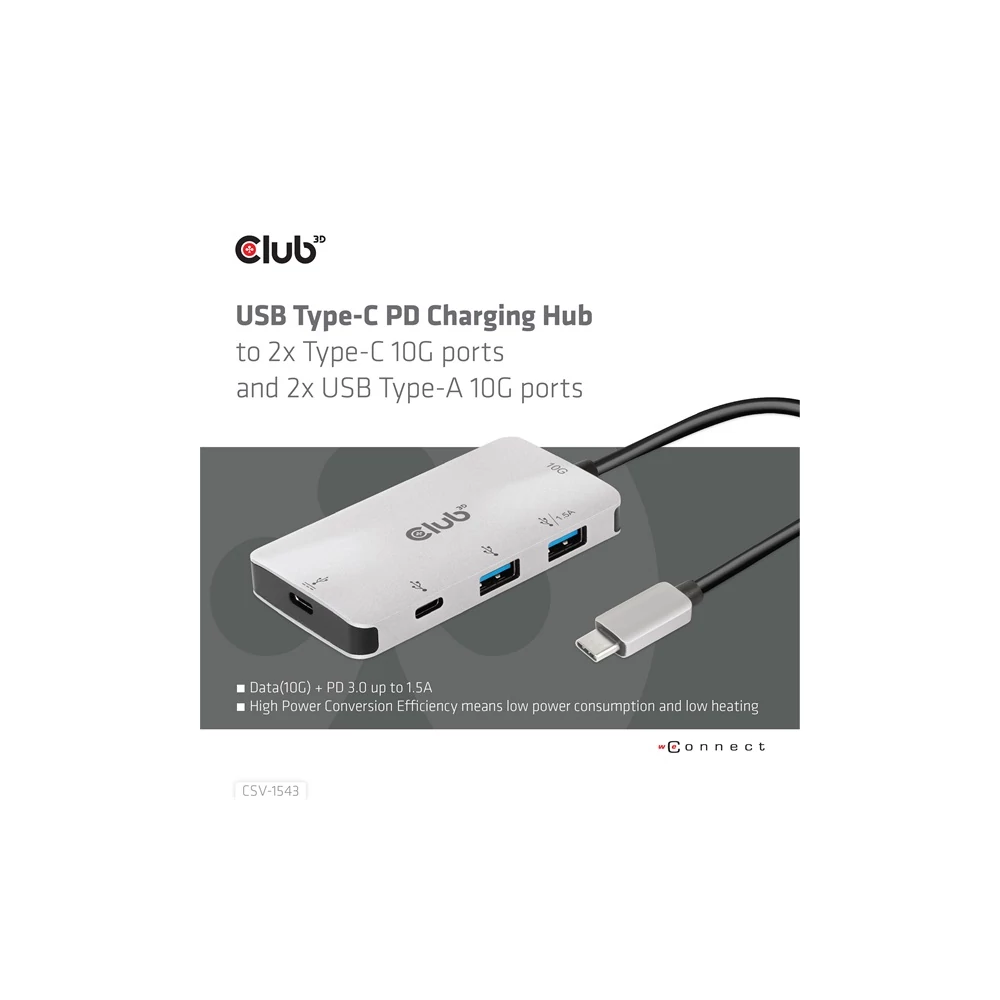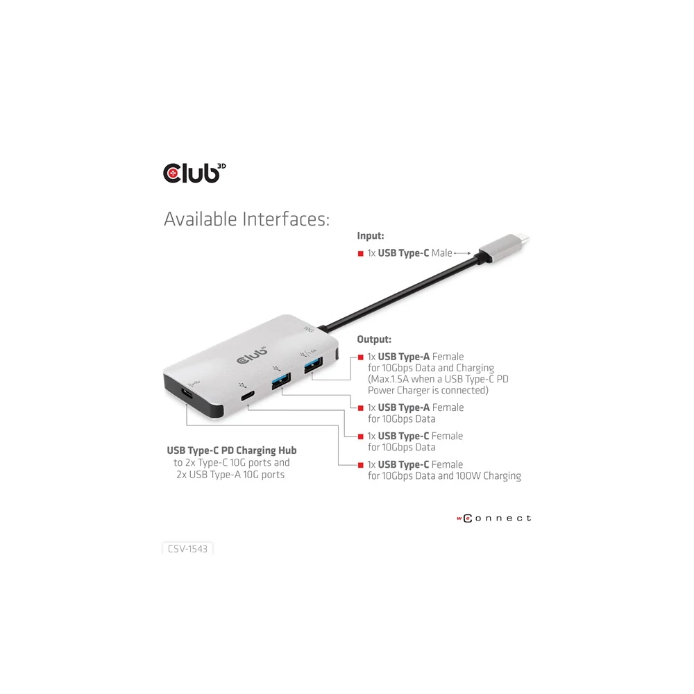 A Club 3D CSV-1543 egy USB Gen2 Type-C PD töltőelosztó 2x Type-C 10G porttal és 2x USB Type-A 10G porttal. A két USB Type-A port adatátvitelre szolgál, és a két USB Type-A port egyike 1,5 A-es töltést biztosít a csatlakoztatott USB Type-A eszközök számára (mobiltelefonok, táblagépek, U-lemezek stb.). A két USB Type-C port egyike adatátvitelre és a csatlakoztatott USB Type-C eszköz töltésére szolgál, a másik USB Type-C port az adat- és a PD3.0 töltést egyaránt támogatja. Működhet bármilyen USB Type-C gazdagépen (PC, notebook, táblagép, mobiltelefon stb.), amely támogatja a Power Delivery 3.0-t.