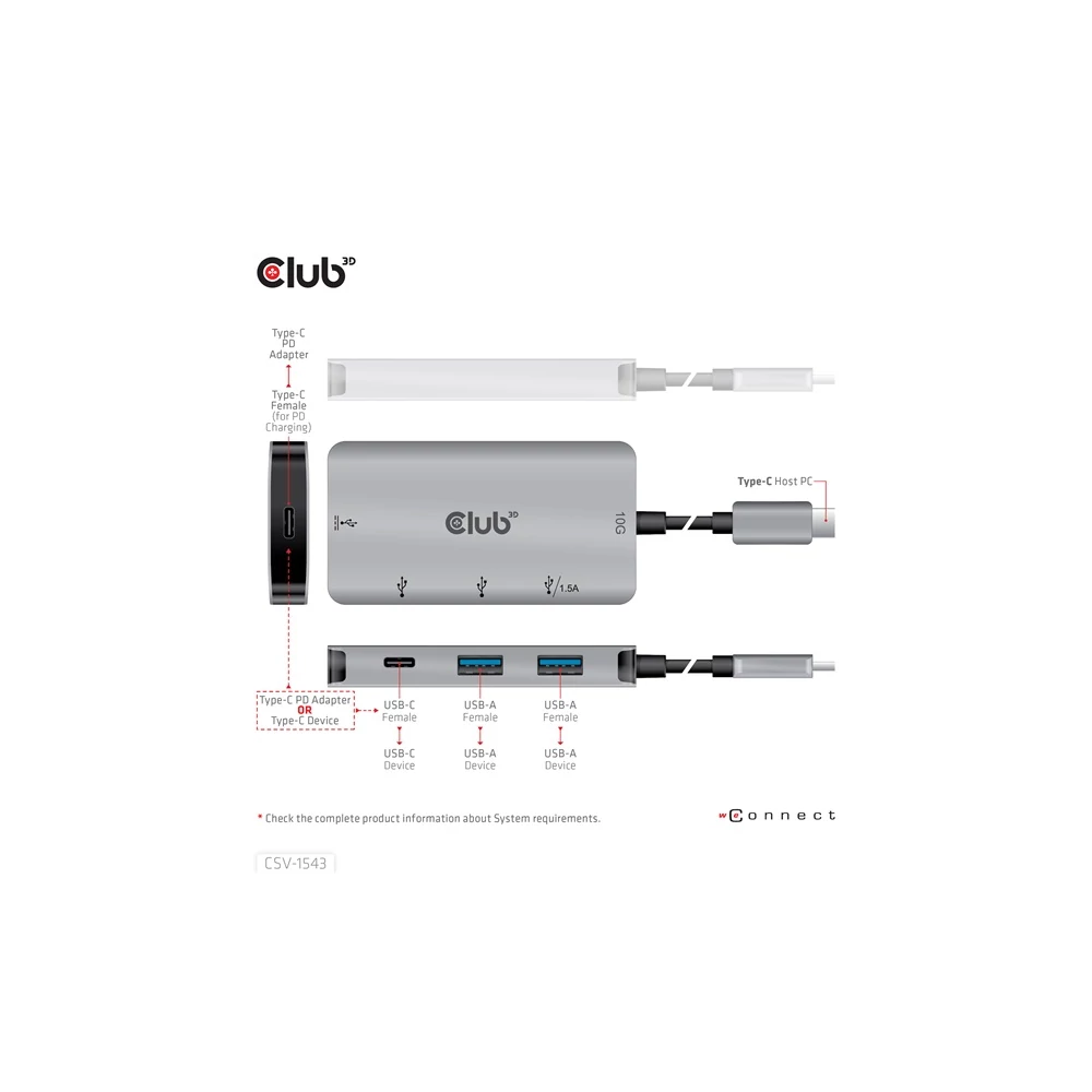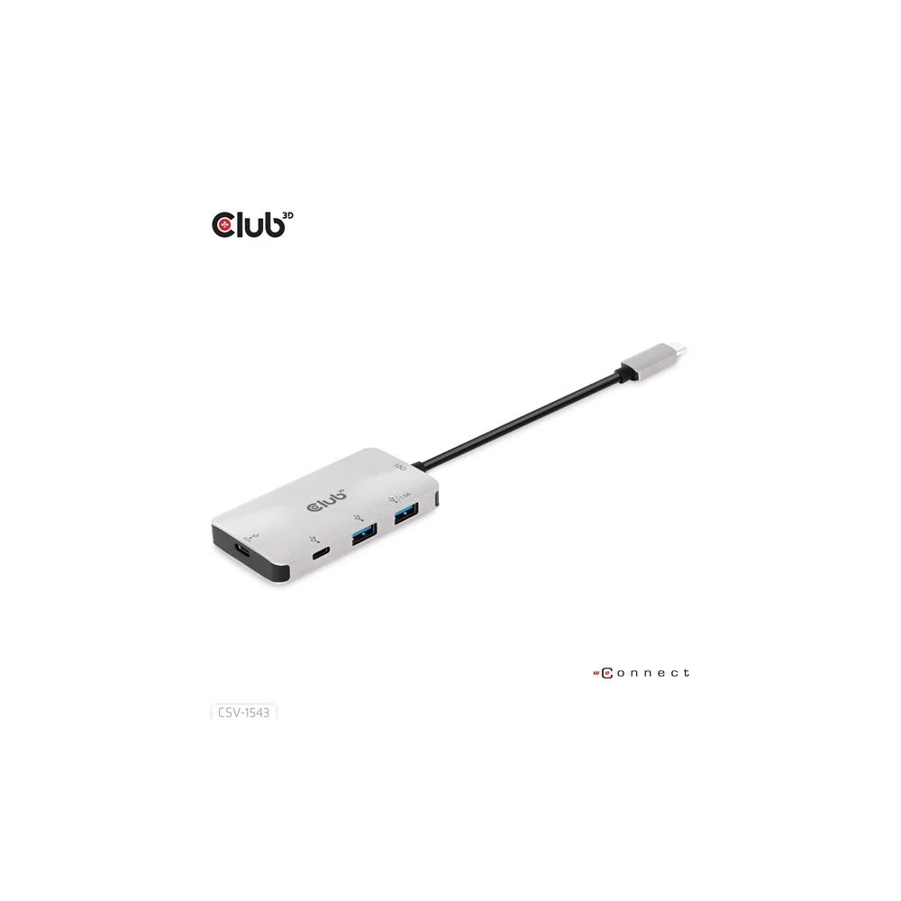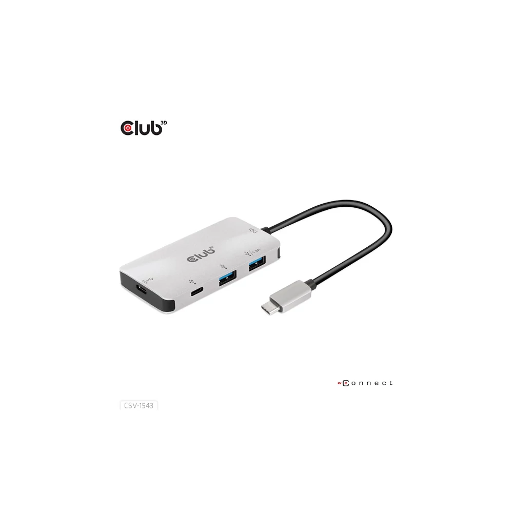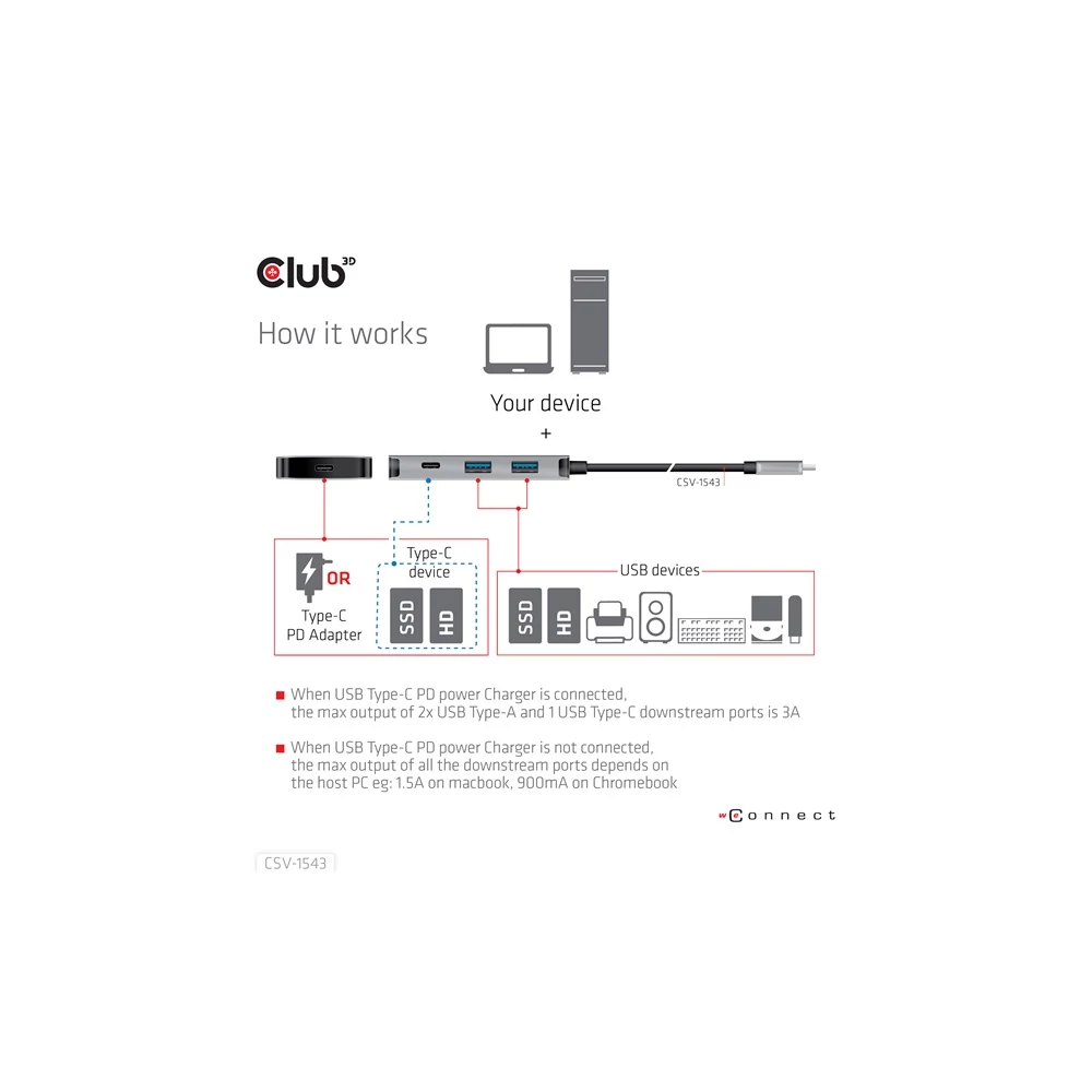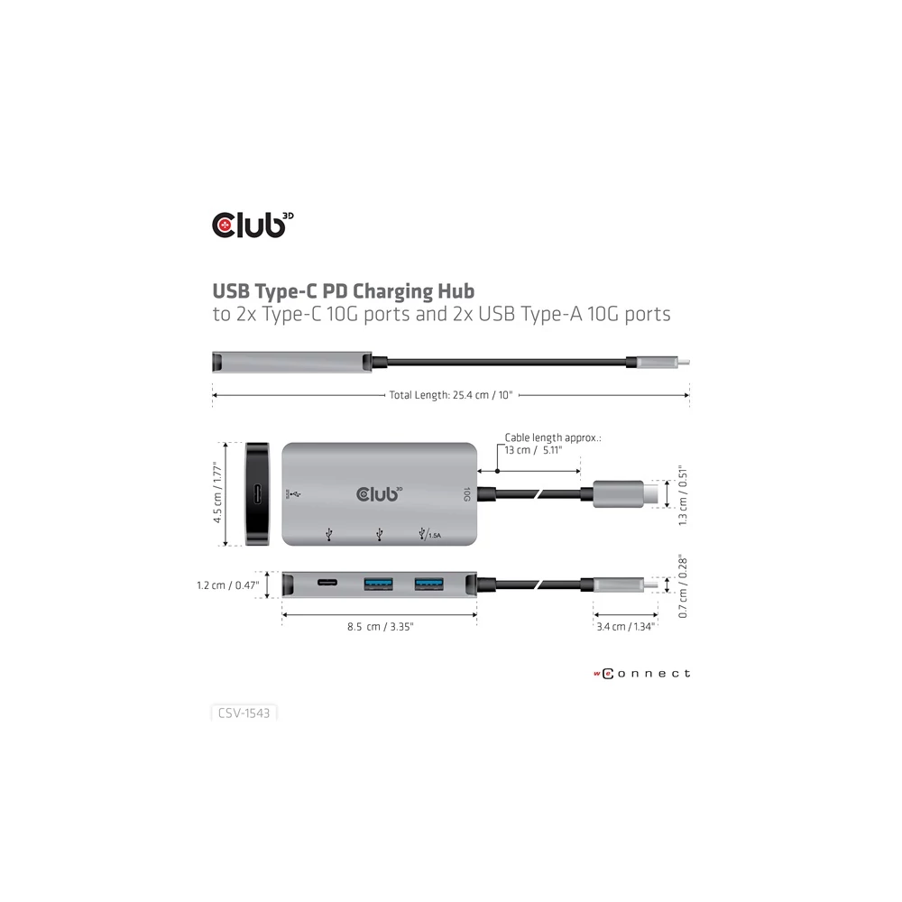 A Club 3D CSV-1543 egy USB Gen2 Type-C PD töltőelosztó 2x Type-C 10G porttal és 2x USB Type-A 10G porttal. A két USB Type-A port adatátvitelre szolgál, és a két USB Type-A port egyike 1,5 A-es töltést biztosít a csatlakoztatott USB Type-A eszközök számára (mobiltelefonok, táblagépek, U-lemezek stb.). A két USB Type-C port egyike adatátvitelre és a csatlakoztatott USB Type-C eszköz töltésére szolgál, a másik USB Type-C port az adat- és a PD3.0 töltést egyaránt támogatja. Működhet bármilyen USB Type-C gazdagépen (PC, notebook, táblagép, mobiltelefon stb.), amely támogatja a Power Delivery 3.0-t.