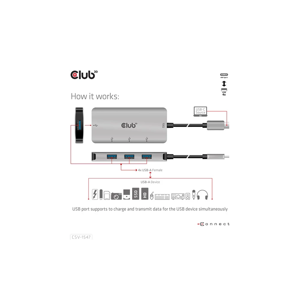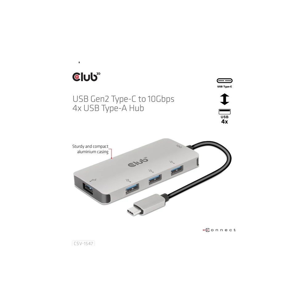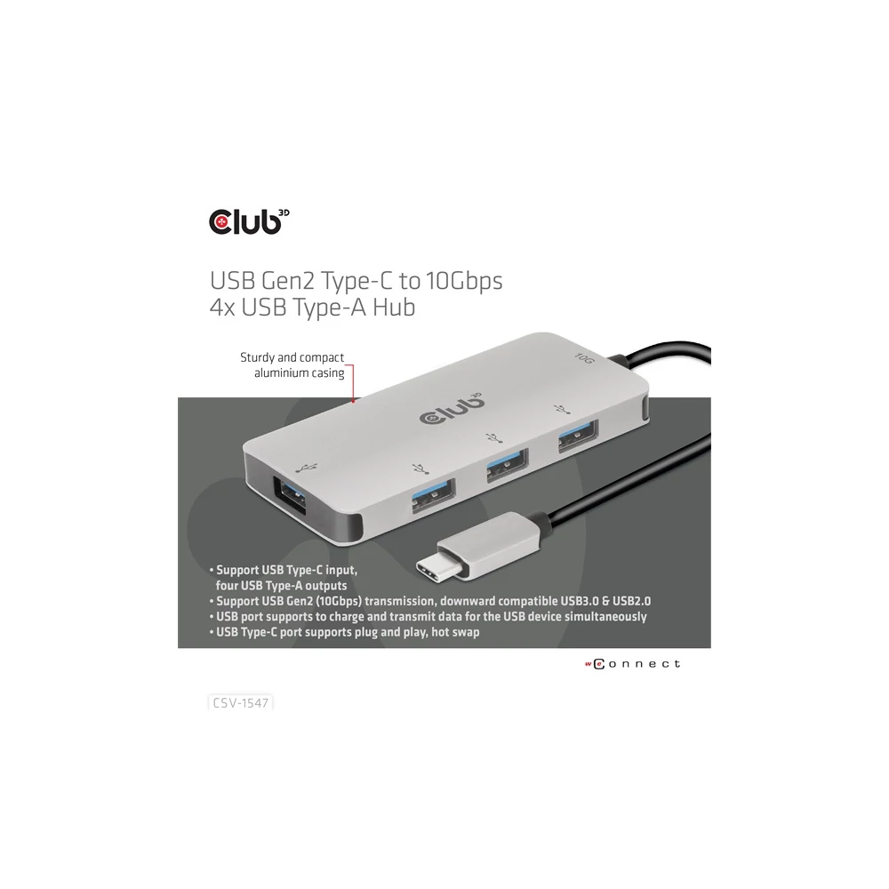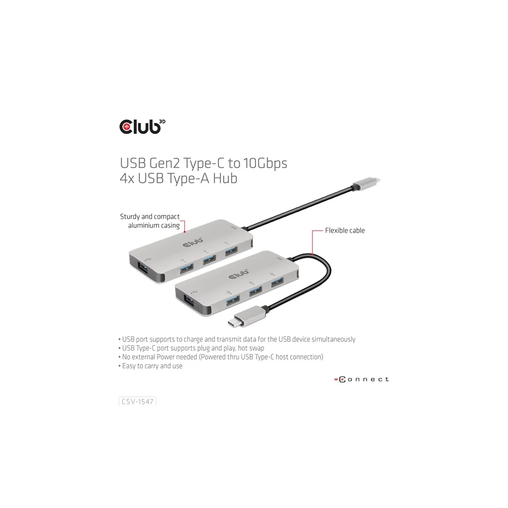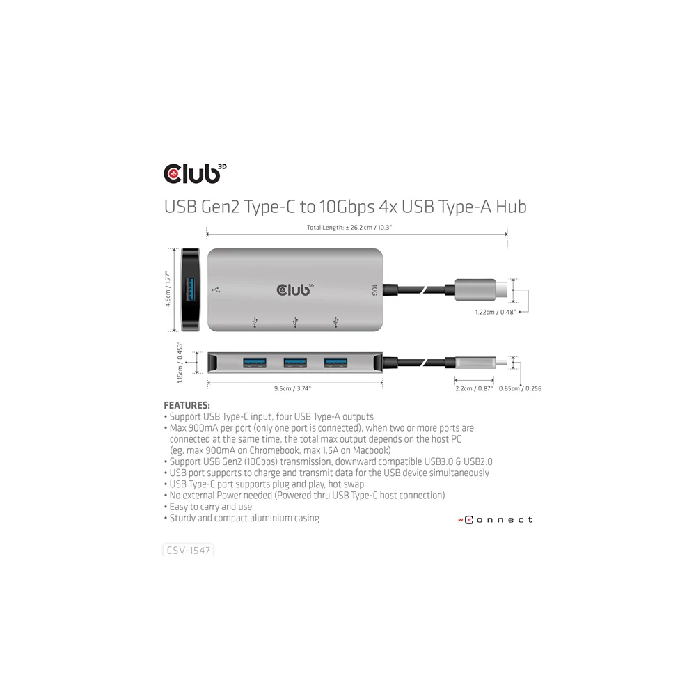 A Club 3D CSV-1547 egy USB Gen2 Type-C és négy USB Type-A port hub, amely négy általános USB Type-A portot ad hozzá az USB Type-C 10G kompatibilis eszközéhez adat- és töltéshez. Bármilyen C típusú gazdagépen működik (PC, notebook, táblagép, mobiltelefon stb.). Minden nagyobb operációs rendszerrel működik.