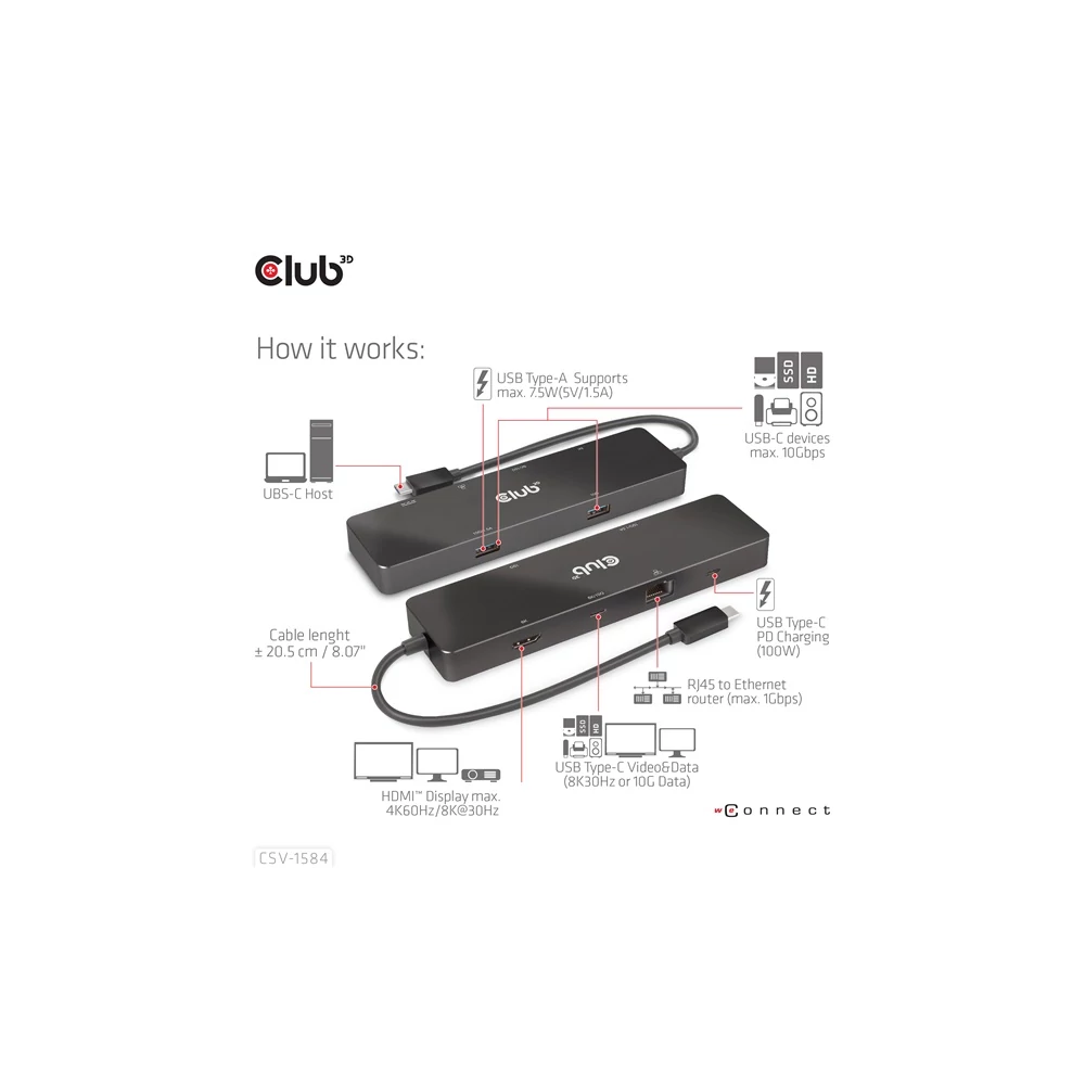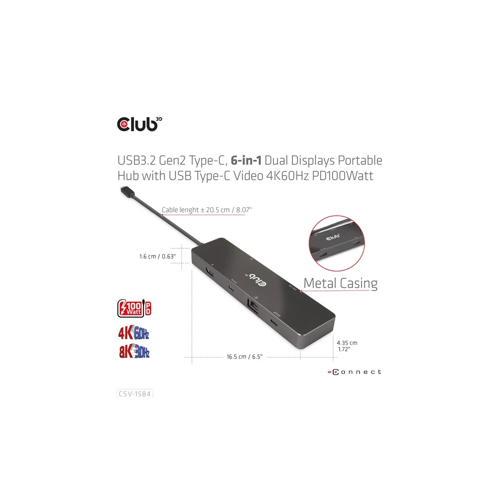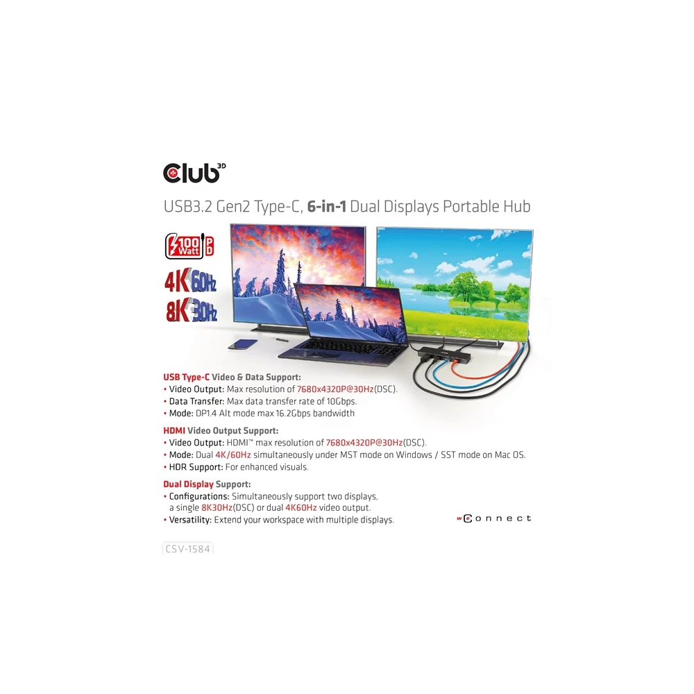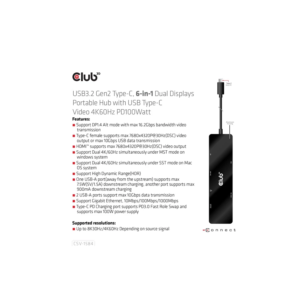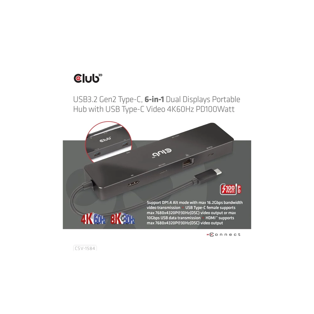 A Club 3D CSV-1584 egy USB3.2 Gen2 Type-C, 6 az 1-ben elosztó HDMI™ 8K30Hz/4K60Hz, 2xUSB Type-A(10G), Ethernet RJ45 (1Gbps) és 2xUSB Type-C, 1x Video4K60Hz) vagy 0 adatátvitellel (x10GG) vagy 0.0. watt, amely ideális megoldást kínál az USB Type-C port vagy a Thunderbolt gazdagép (PC/Laptop/Mobiltelefon stb.) bővítésére, különösen az egyetlen USB Type-C porttal rendelkező gépek számára. Ez a hub DP1.4 Alt móddal támogatott IC-t alkalmaz, amely lehetővé teszi legfeljebb egyetlen 8K30Hz-es (DSC) vagy két különböző videó (2-szer 4K60Hz) kimenetét, az USB Type-C Videoport pedig támogatja az USB3.2 Gen2 adatok átvitelét is maximum 10 Gbps sebességgel. 2 USB Type-A és USB Type-C Video port lehetővé teszi 3 USB-eszköz egyidejű csatlakoztatását. A Gigabit Ethernet port lehetővé teszi az internetezést, az USB Type-C PD töltőport pedig maximum 100 W PD töltést támogat. Minden DP Alt móddal támogatott USB Type-C gazdagépen működik.