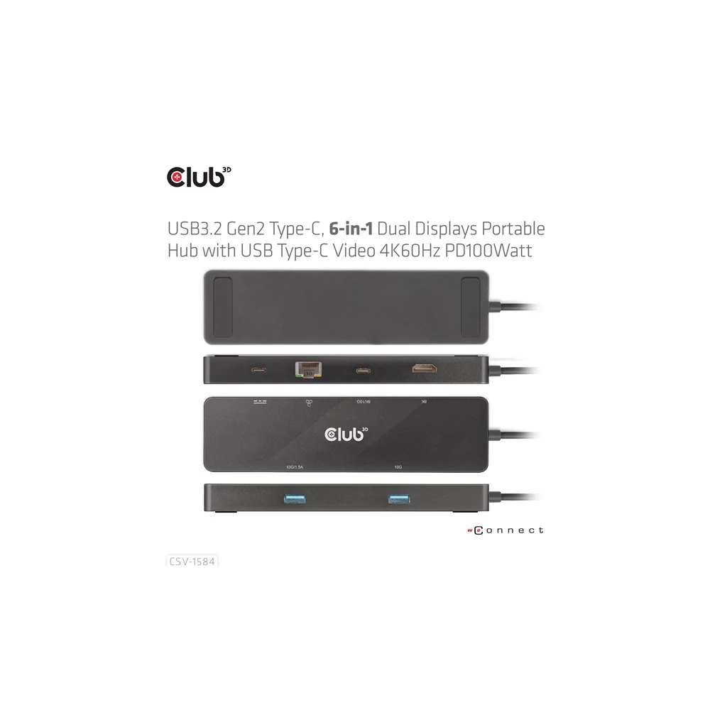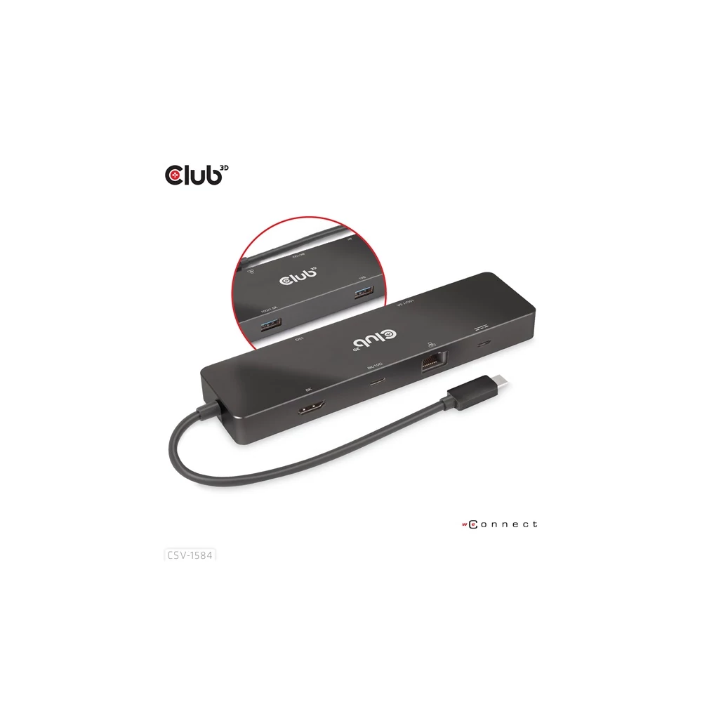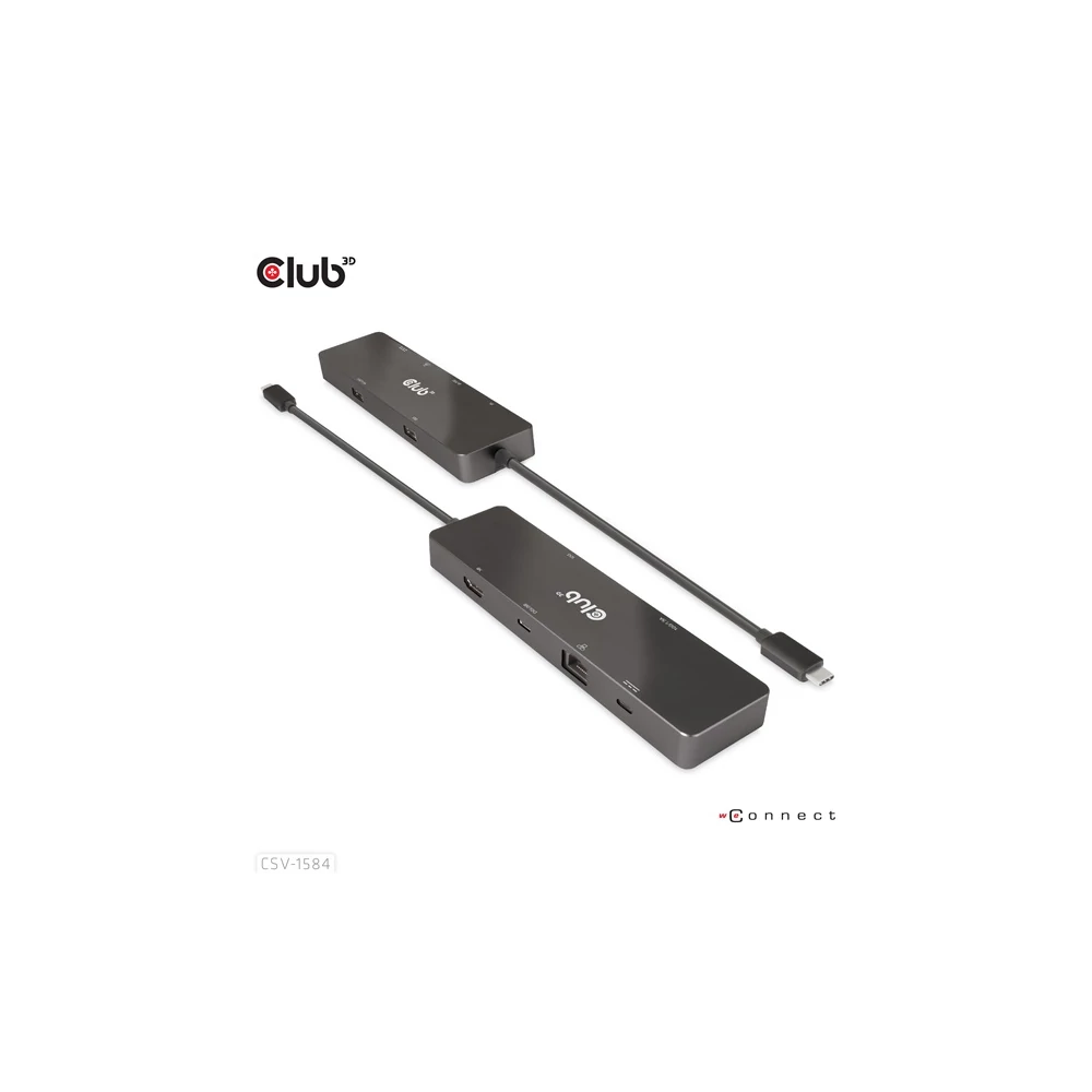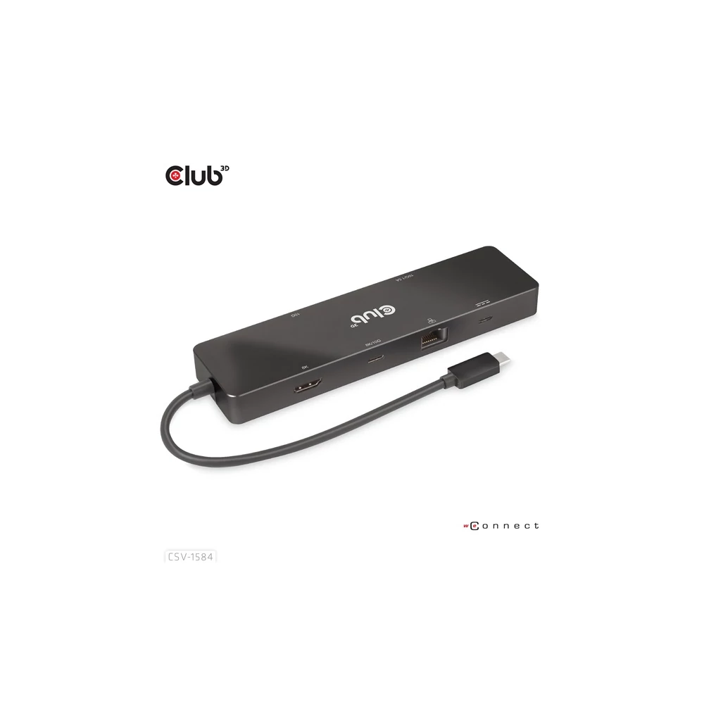 A Club 3D CSV-1584 egy USB3.2 Gen2 Type-C, 6 az 1-ben elosztó HDMI™ 8K30Hz/4K60Hz, 2xUSB Type-A(10G), Ethernet RJ45 (1Gbps) és 2xUSB Type-C, 1x Video4K60Hz) vagy 0 adatátvitellel (x10GG) vagy 0.0. watt, amely ideális megoldást kínál az USB Type-C port vagy a Thunderbolt gazdagép (PC/Laptop/Mobiltelefon stb.) bővítésére, különösen az egyetlen USB Type-C porttal rendelkező gépek számára. Ez a hub DP1.4 Alt móddal támogatott IC-t alkalmaz, amely lehetővé teszi legfeljebb egyetlen 8K30Hz-es (DSC) vagy két különböző videó (2-szer 4K60Hz) kimenetét, az USB Type-C Videoport pedig támogatja az USB3.2 Gen2 adatok átvitelét is maximum 10 Gbps sebességgel. 2 USB Type-A és USB Type-C Video port lehetővé teszi 3 USB-eszköz egyidejű csatlakoztatását. A Gigabit Ethernet port lehetővé teszi az internetezést, az USB Type-C PD töltőport pedig maximum 100 W PD töltést támogat. Minden DP Alt móddal támogatott USB Type-C gazdagépen működik.