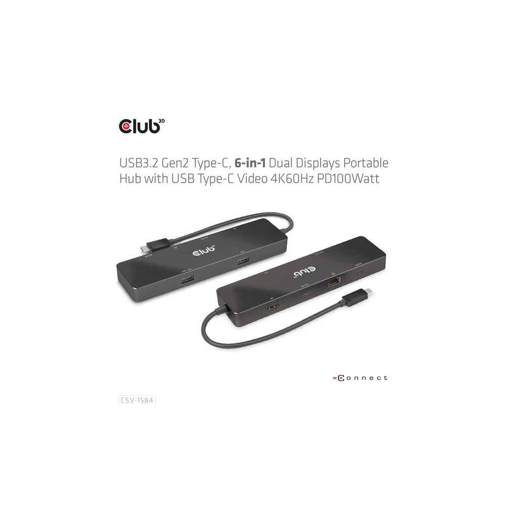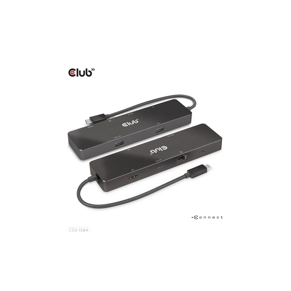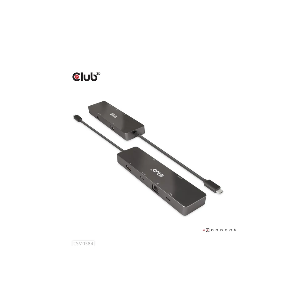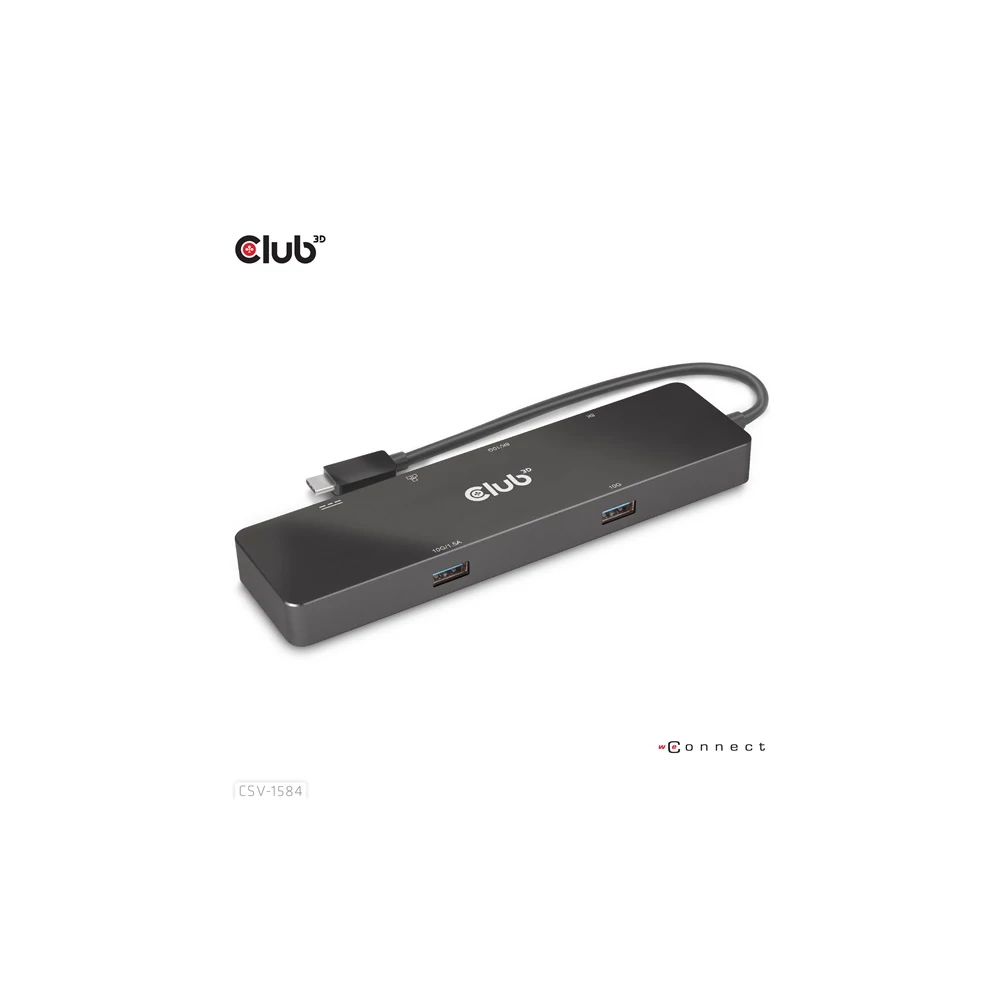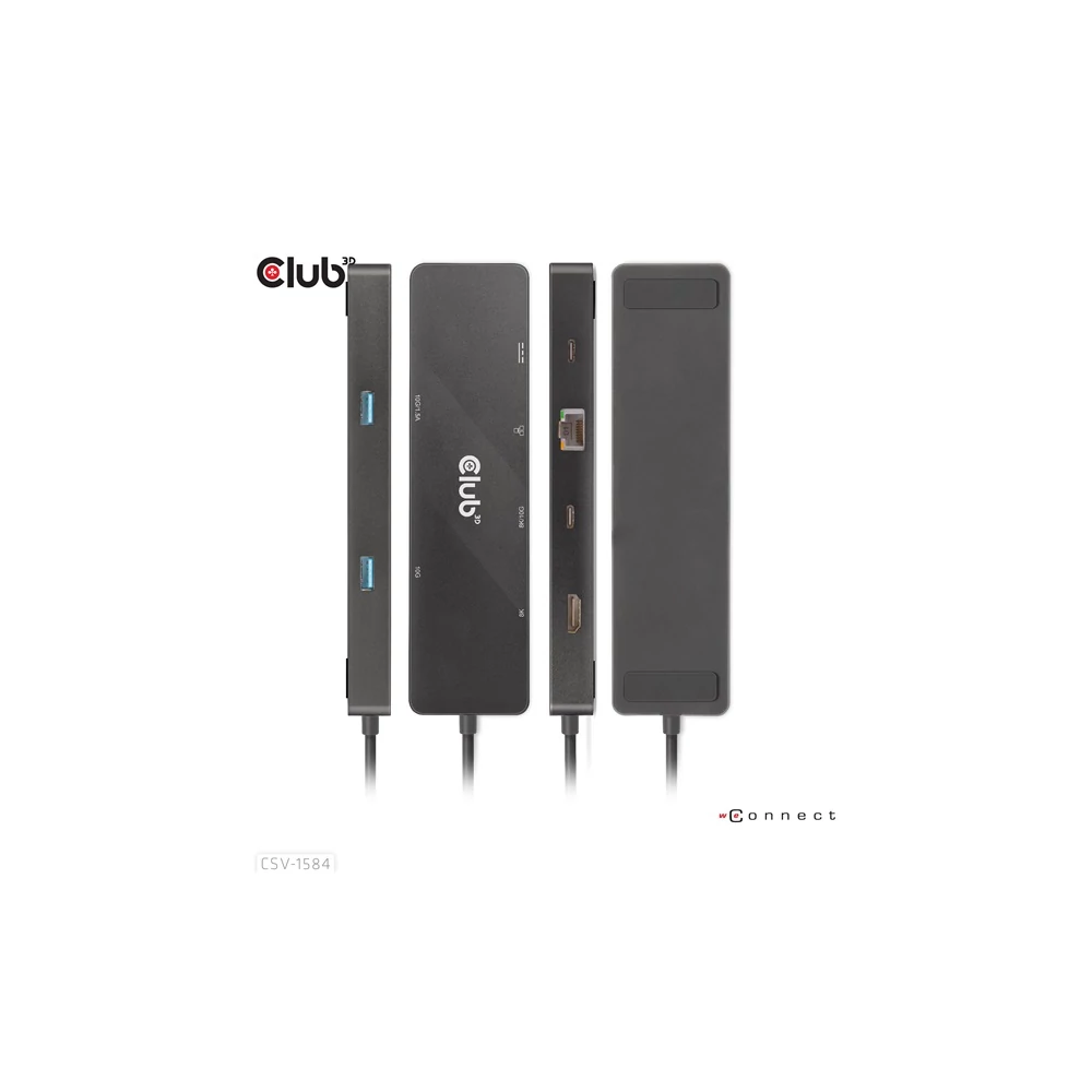 A Club 3D CSV-1584 egy USB3.2 Gen2 Type-C, 6 az 1-ben elosztó HDMI™ 8K30Hz/4K60Hz, 2xUSB Type-A(10G), Ethernet RJ45 (1Gbps) és 2xUSB Type-C, 1x Video4K60Hz) vagy 0 adatátvitellel (x10GG) vagy 0.0. watt, amely ideális megoldást kínál az USB Type-C port vagy a Thunderbolt gazdagép (PC/Laptop/Mobiltelefon stb.) bővítésére, különösen az egyetlen USB Type-C porttal rendelkező gépek számára. Ez a hub DP1.4 Alt móddal támogatott IC-t alkalmaz, amely lehetővé teszi legfeljebb egyetlen 8K30Hz-es (DSC) vagy két különböző videó (2-szer 4K60Hz) kimenetét, az USB Type-C Videoport pedig támogatja az USB3.2 Gen2 adatok átvitelét is maximum 10 Gbps sebességgel. 2 USB Type-A és USB Type-C Video port lehetővé teszi 3 USB-eszköz egyidejű csatlakoztatását. A Gigabit Ethernet port lehetővé teszi az internetezést, az USB Type-C PD töltőport pedig maximum 100 W PD töltést támogat. Minden DP Alt móddal támogatott USB Type-C gazdagépen működik.