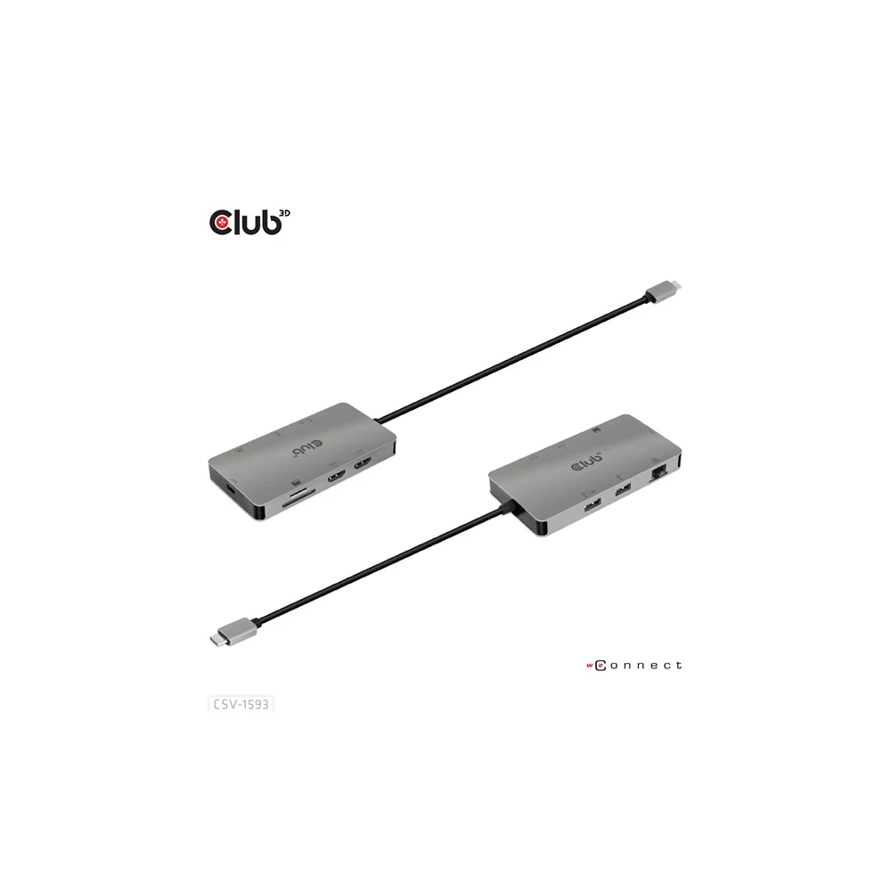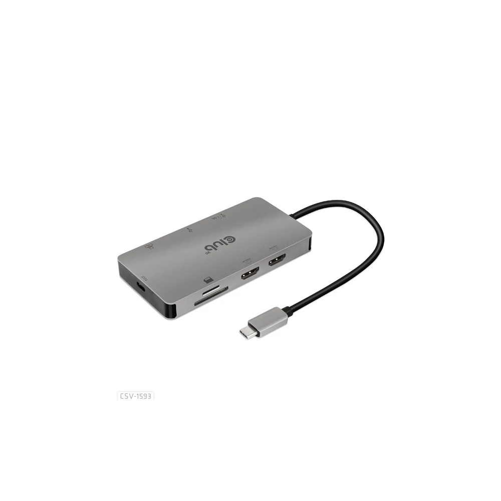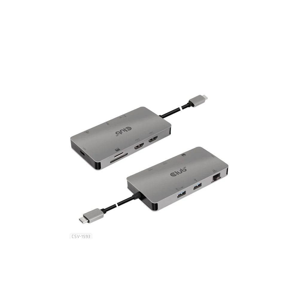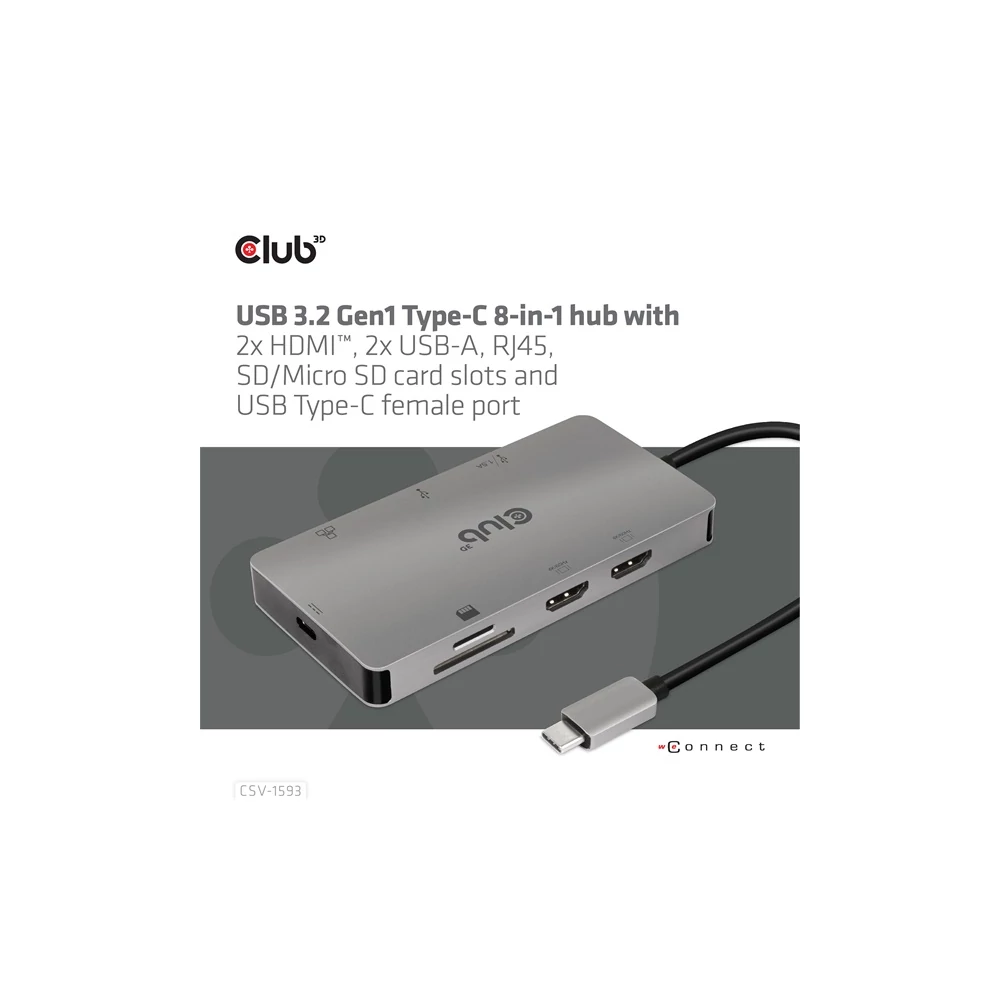 A Club 3D CSV-1593 USB 3.2 Gen1 Type-C 8-in-1 hub 2 HDMI™-vel, 2 USB-A-val, RJ45-tel, SD/Micro SD kártyanyílással és Type-C csatlakozóaljzattal, ideális megoldást biztosítva az USB3.2 Gen1 Type-C vagy Thunderbolt™3 gazdaport bővítésére (PC/Laptop telefon,/Mobi). Különösen azoknak a gépeknek, amelyek egyetlen Type-C porttal rendelkeznek. Ez a hub a legújabb DP1.4 Alt mód támogatást alkalmazza, lehetővé téve a HDMI™ videó kimenetét max. 4k60Hz-en vagy kettős maximum 4K30Hz-en MST módban, és egyidejűleg USB 3.2Gen1 adatátvitelt maximum 5Gbps sebességgel. A 2x USB Type-A port lehetővé teszi 2 USB-eszköz egyidejű csatlakoztatását. Az SD/Micro SD portok lehetővé teszik 2 kártya egyidejű behelyezését a nyílásokba adatátvitelhez vagy információk olvasásához/írásához a gazdagépen. Az RJ45 port lehetővé teszi a gazdagép számára a Gigabit Ethernet hozzáférést. Emellett az USB 3.2 Gen1 Type-C anya támogatja a PD 3.0-t max. 100W PD töltés. Minden USB3.2 Gen1 Type-C és Thunderbolt™3 gazdagépen működik, amely támogatja a DP Alt módot (beleértve a DP1.2 és DP1.4 Alt módot is). Amikor Thunderbolt™3 gazdagépen dolgozik, ez a termék DP jelet továbbít.