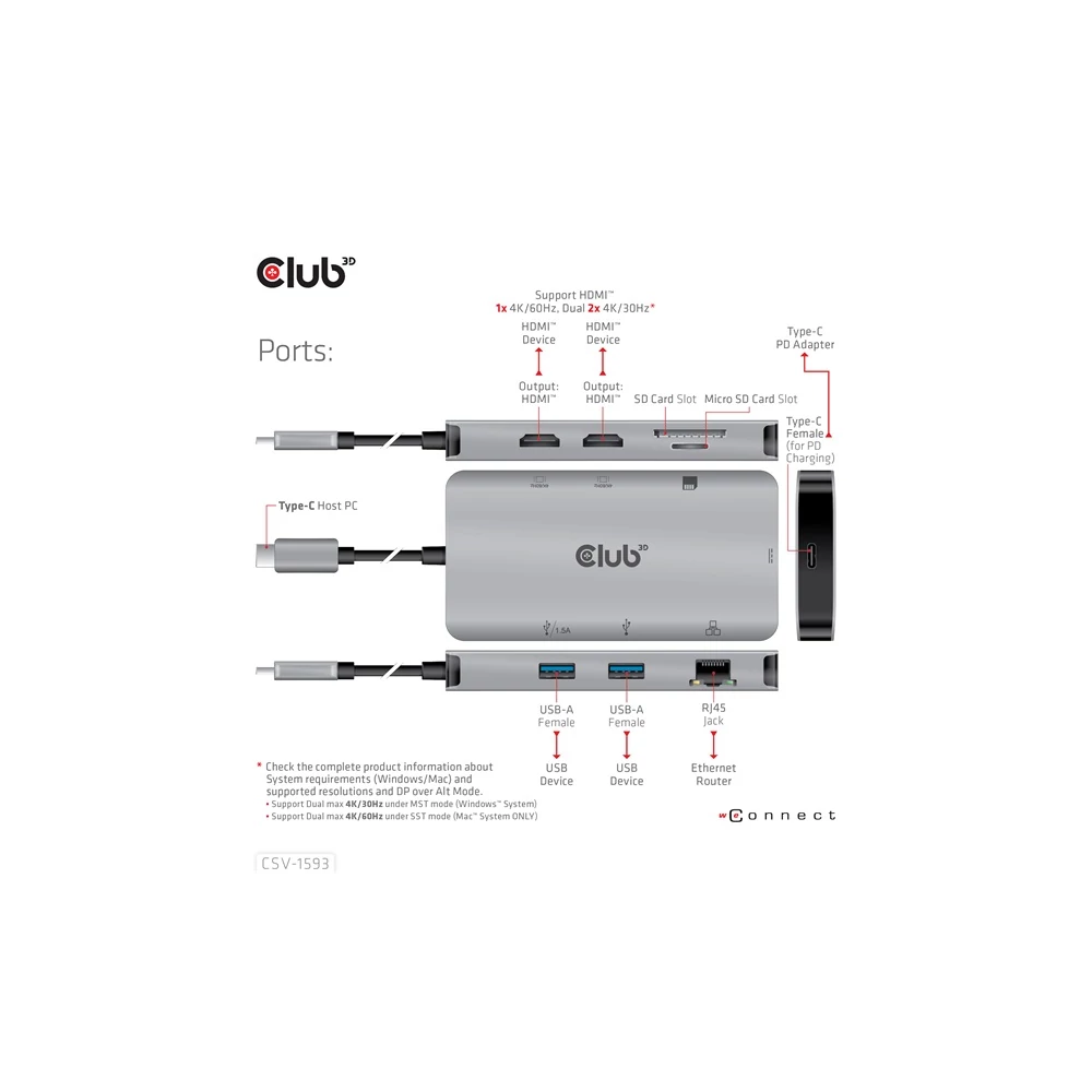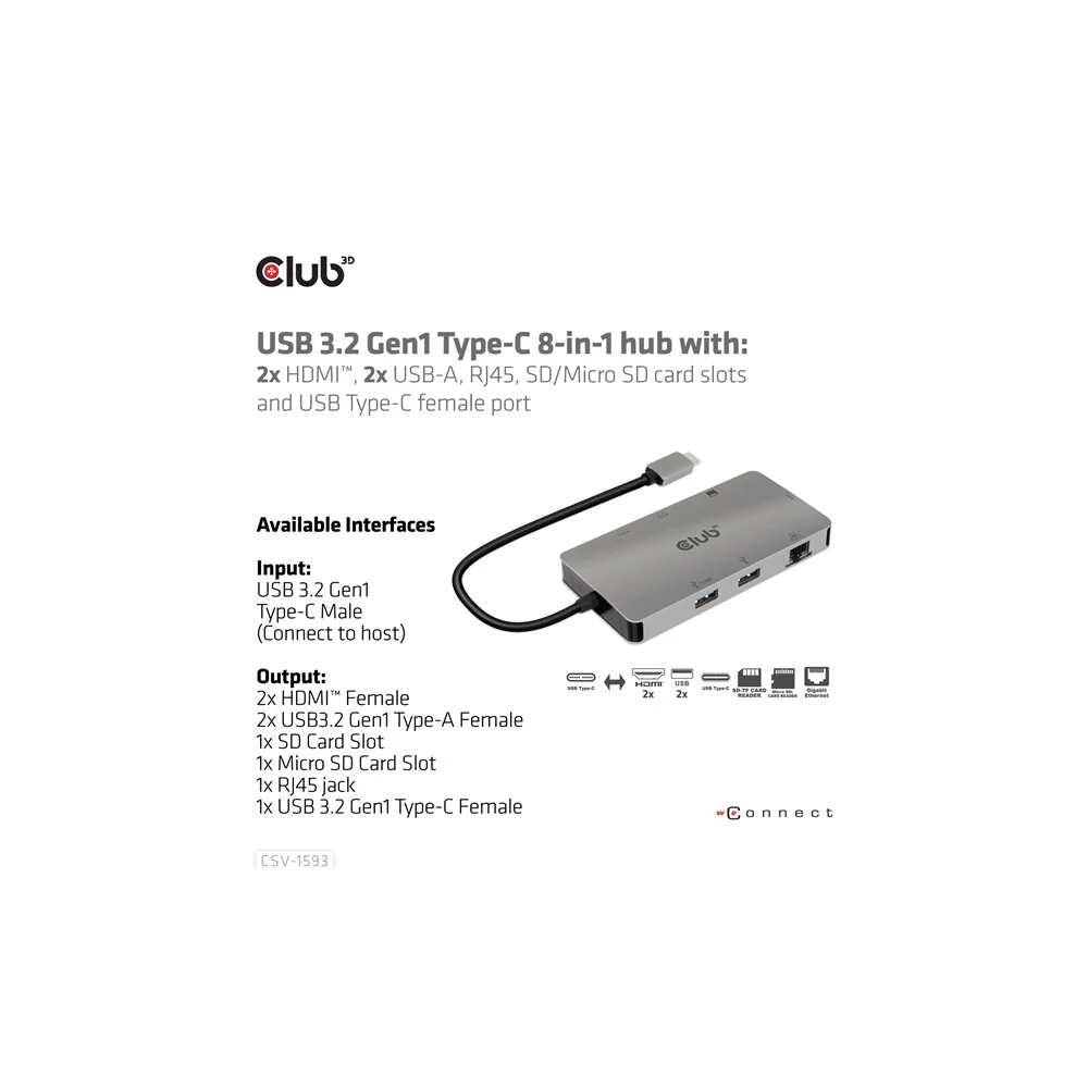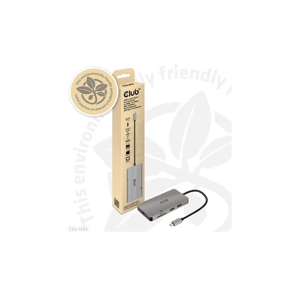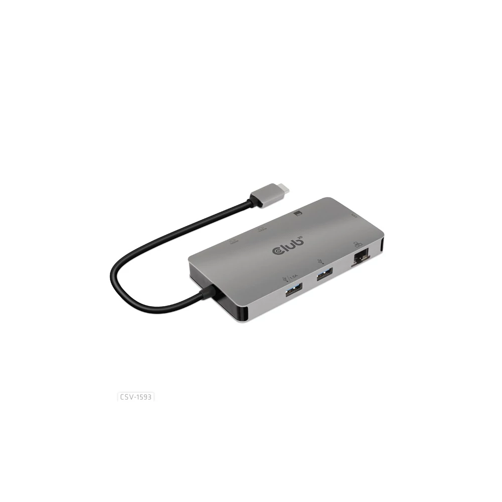 A Club 3D CSV-1593 USB 3.2 Gen1 Type-C 8-in-1 hub 2 HDMI™-vel, 2 USB-A-val, RJ45-tel, SD/Micro SD kártyanyílással és Type-C csatlakozóaljzattal, ideális megoldást biztosítva az USB3.2 Gen1 Type-C vagy Thunderbolt™3 gazdaport bővítésére (PC/Laptop telefon,/Mobi). Különösen azoknak a gépeknek, amelyek egyetlen Type-C porttal rendelkeznek. Ez a hub a legújabb DP1.4 Alt mód támogatást alkalmazza, lehetővé téve a HDMI™ videó kimenetét max. 4k60Hz-en vagy kettős maximum 4K30Hz-en MST módban, és egyidejűleg USB 3.2Gen1 adatátvitelt maximum 5Gbps sebességgel. A 2x USB Type-A port lehetővé teszi 2 USB-eszköz egyidejű csatlakoztatását. Az SD/Micro SD portok lehetővé teszik 2 kártya egyidejű behelyezését a nyílásokba adatátvitelhez vagy információk olvasásához/írásához a gazdagépen. Az RJ45 port lehetővé teszi a gazdagép számára a Gigabit Ethernet hozzáférést. Emellett az USB 3.2 Gen1 Type-C anya támogatja a PD 3.0-t max. 100W PD töltés. Minden USB3.2 Gen1 Type-C és Thunderbolt™3 gazdagépen működik, amely támogatja a DP Alt módot (beleértve a DP1.2 és DP1.4 Alt módot is). Amikor Thunderbolt™3 gazdagépen dolgozik, ez a termék DP jelet továbbít.