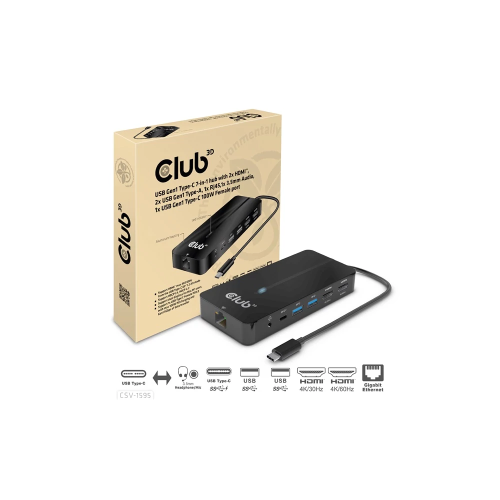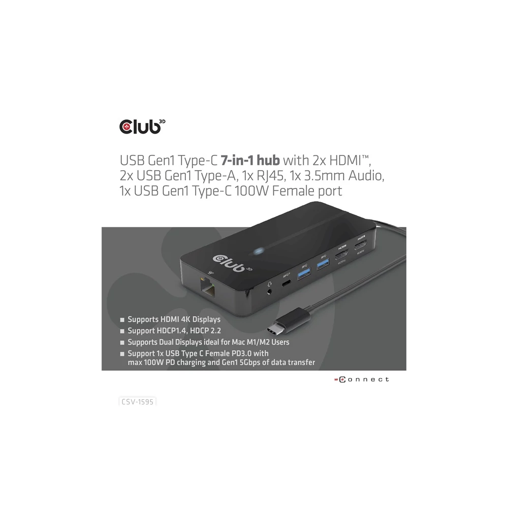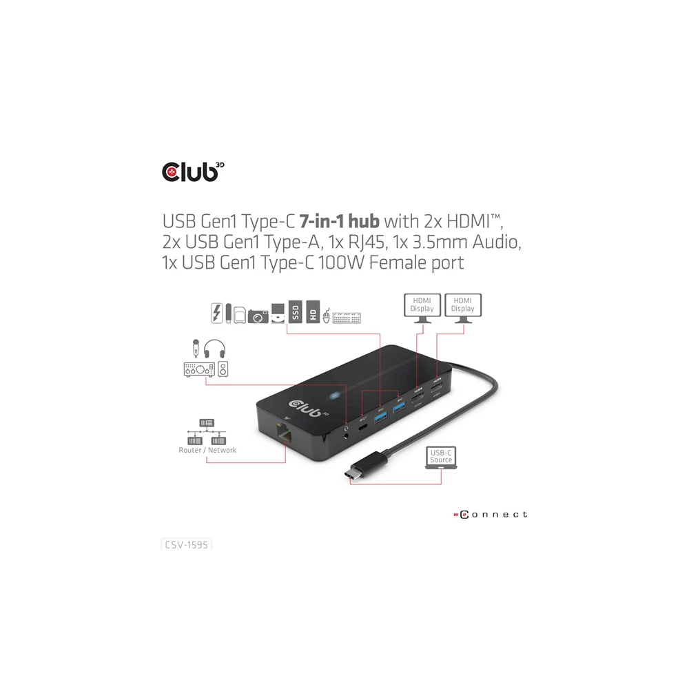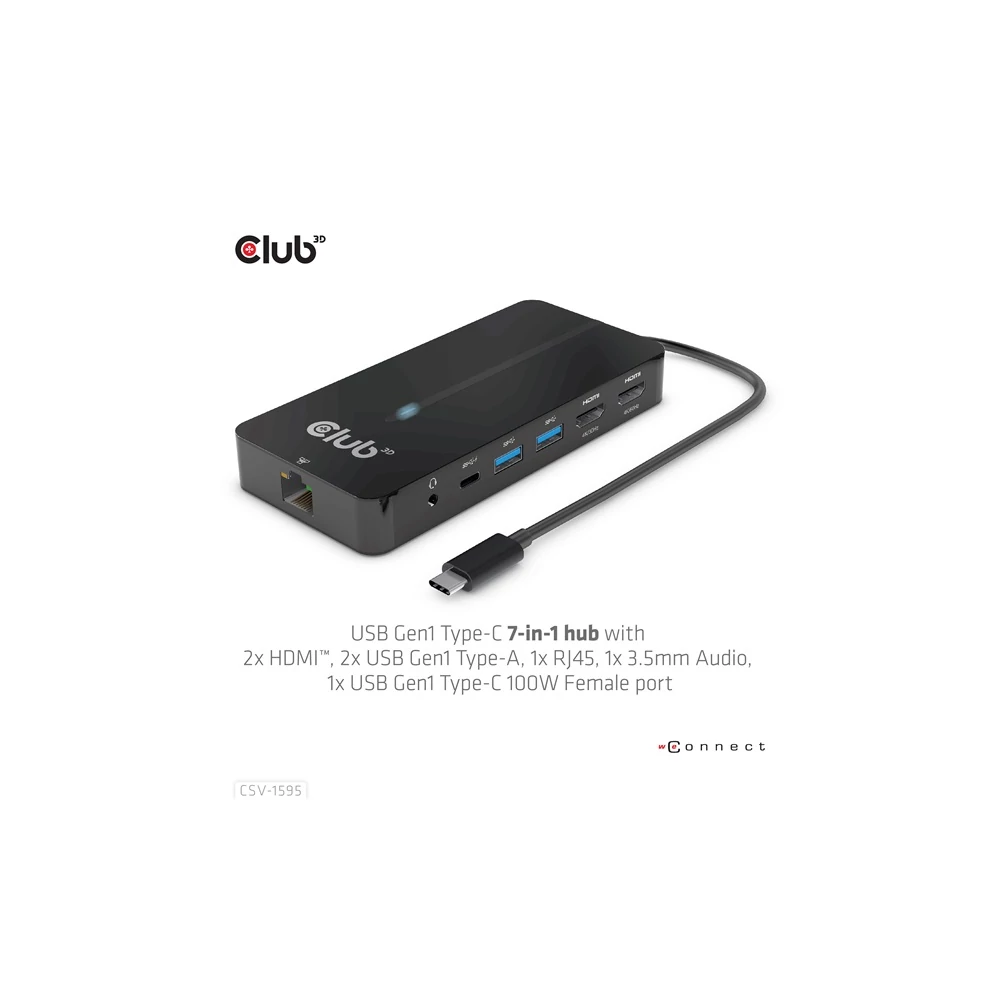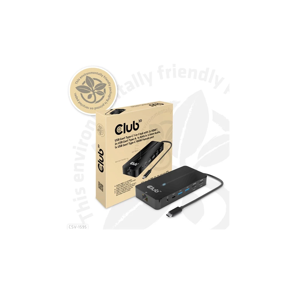 A Club 3D CSV-1595 USB Gen1 Type-C 7 az 1-ben hub 2x HDMI™-vel, 2x USB Gen1 Type-A-val, 1x RJ45-tel, 1x 3,5 mm-es hanggal, 1x USB Gen1 Type-C 100W női porttal, nagyon fejlett, hatékony megoldást kínál egyetlen USB Gen1-C port bővítésére. Integrált video-, adat- és tápcsatlakozókkal, amely lehetővé teszi két kijelző egyidejű csatlakoztatását, hogy nagyobb képernyőn élvezhesse a videókat, több USB Gen1 eszközt csatlakoztasson akár 5 Gbps-os adatátvitelhez, Gigabit Ethernet forrást csatlakoztasson számítógépe szupergyors hálózathoz, vagy fejhallgatóhoz csatlakozzon a fantasztikus zene élvezetéhez. PD töltést is biztosít max. 100W PD töltés. Ez az eszköz működtetésére és a gazdagép egyidejű töltésére szolgál. Minden DP™1.4 Alt móddal támogatott USB Gen1 Type-C gazdagépen működik.