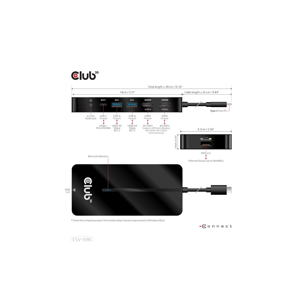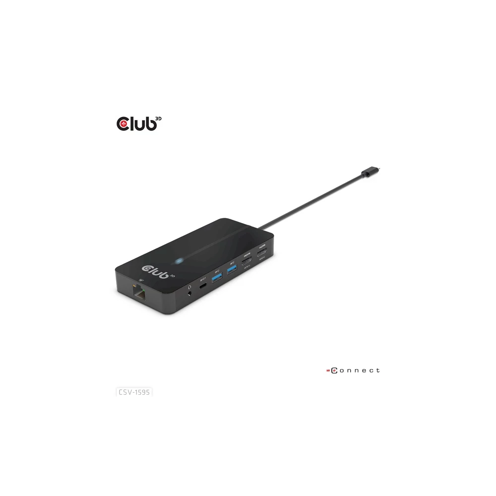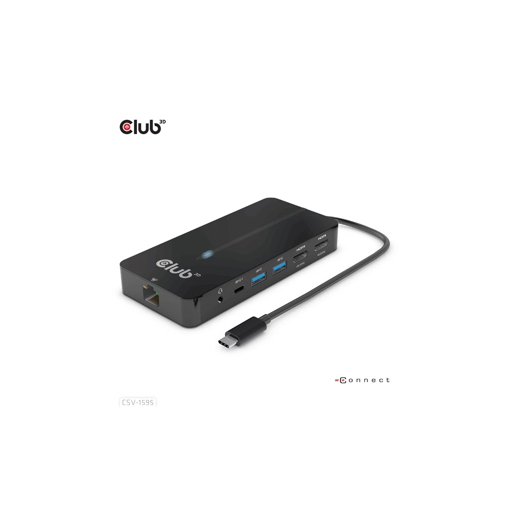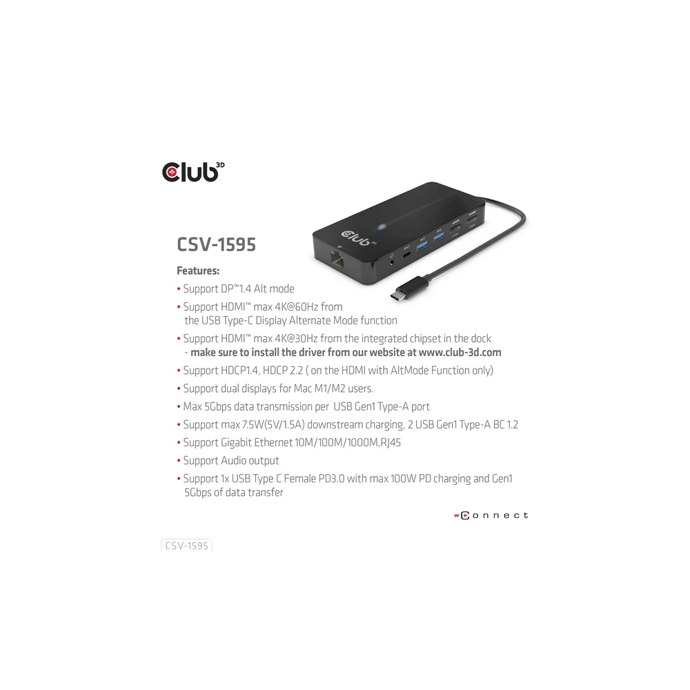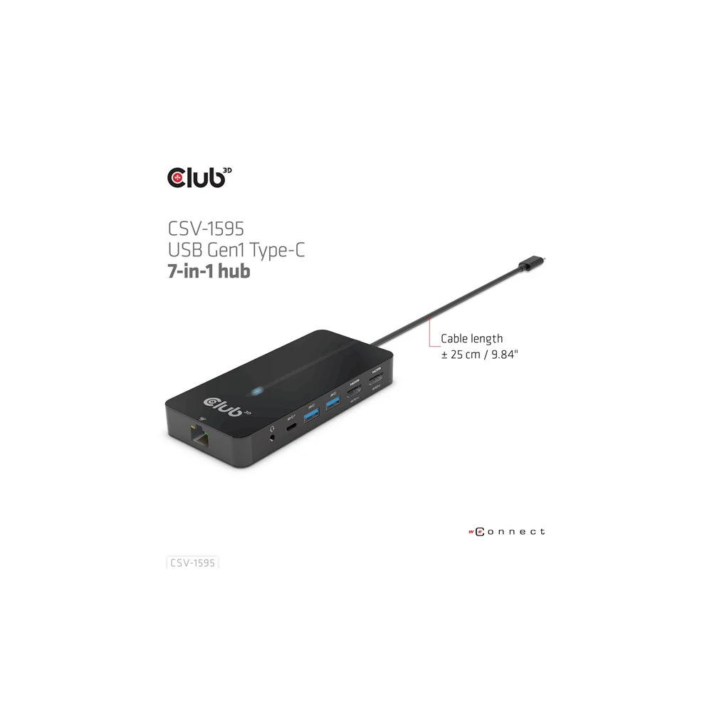 A Club 3D CSV-1595 USB Gen1 Type-C 7 az 1-ben hub 2x HDMI™-vel, 2x USB Gen1 Type-A-val, 1x RJ45-tel, 1x 3,5 mm-es hanggal, 1x USB Gen1 Type-C 100W női porttal, nagyon fejlett, hatékony megoldást kínál egyetlen USB Gen1-C port bővítésére. Integrált video-, adat- és tápcsatlakozókkal, amely lehetővé teszi két kijelző egyidejű csatlakoztatását, hogy nagyobb képernyőn élvezhesse a videókat, több USB Gen1 eszközt csatlakoztasson akár 5 Gbps-os adatátvitelhez, Gigabit Ethernet forrást csatlakoztasson számítógépe szupergyors hálózathoz, vagy fejhallgatóhoz csatlakozzon a fantasztikus zene élvezetéhez. PD töltést is biztosít max. 100W PD töltés. Ez az eszköz működtetésére és a gazdagép egyidejű töltésére szolgál. Minden DP™1.4 Alt móddal támogatott USB Gen1 Type-C gazdagépen működik.
