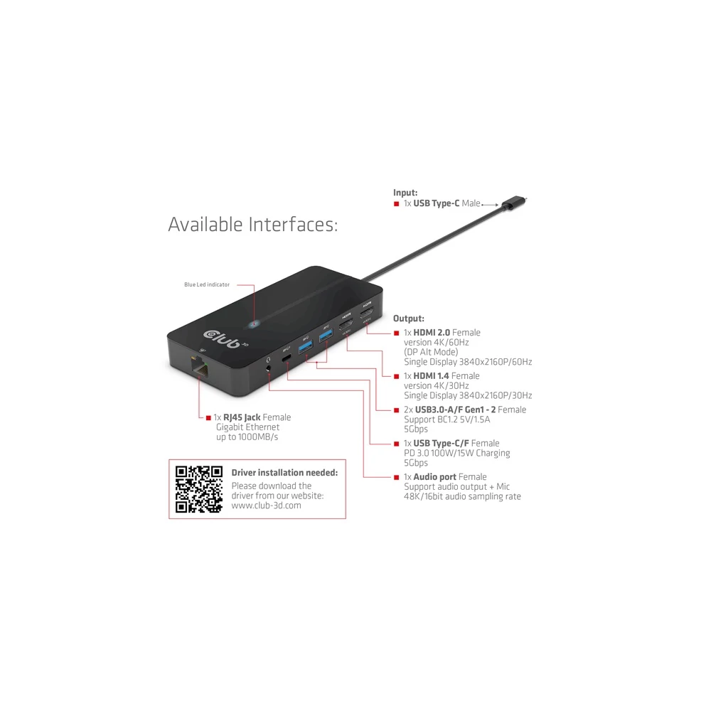 • Támogatja a HDMI™ max 4K@30Hz-et a dokkolóban lévő integrált lapkakészletről – feltétlenül telepítse az illesztőprogramot a www.club-3d.com webhelyről