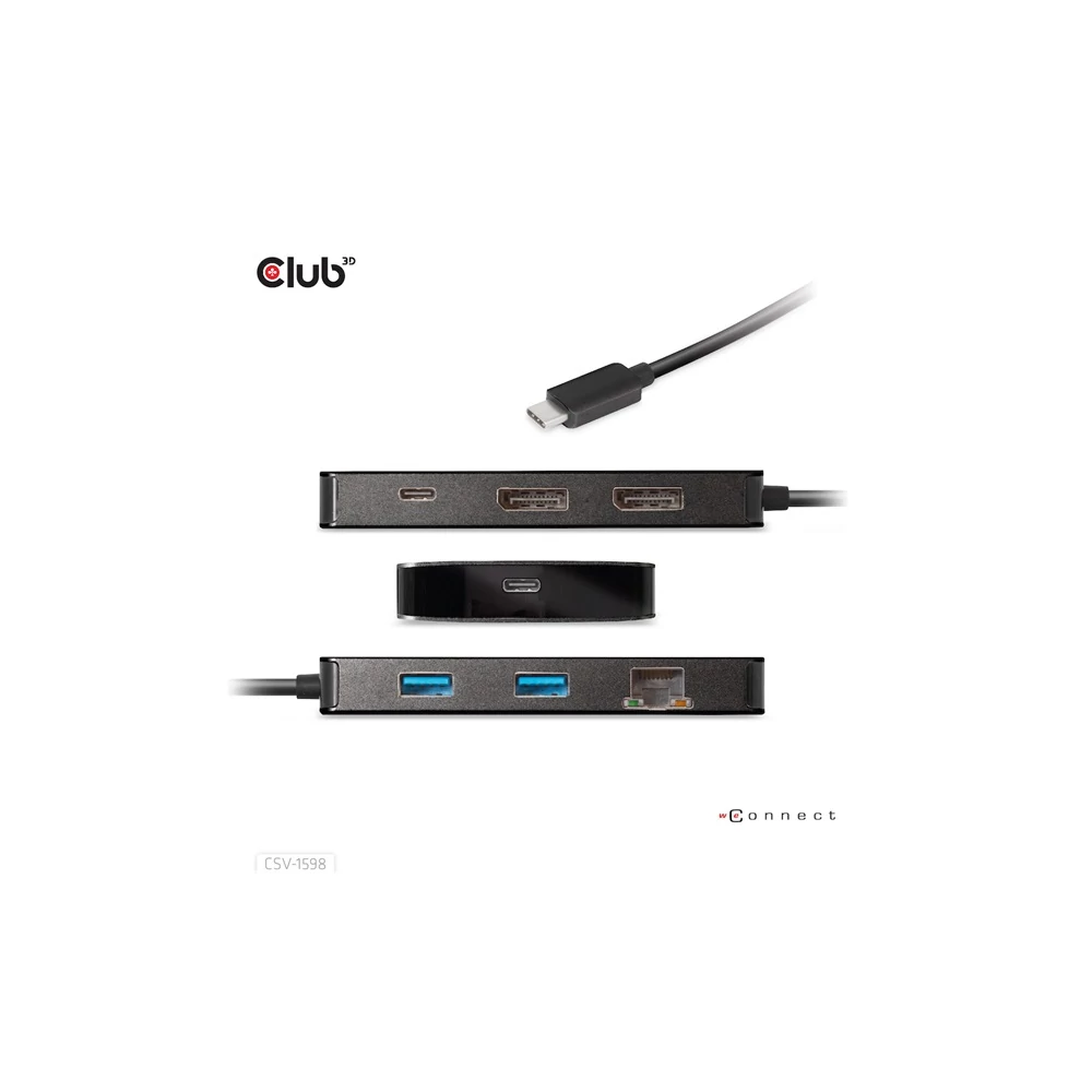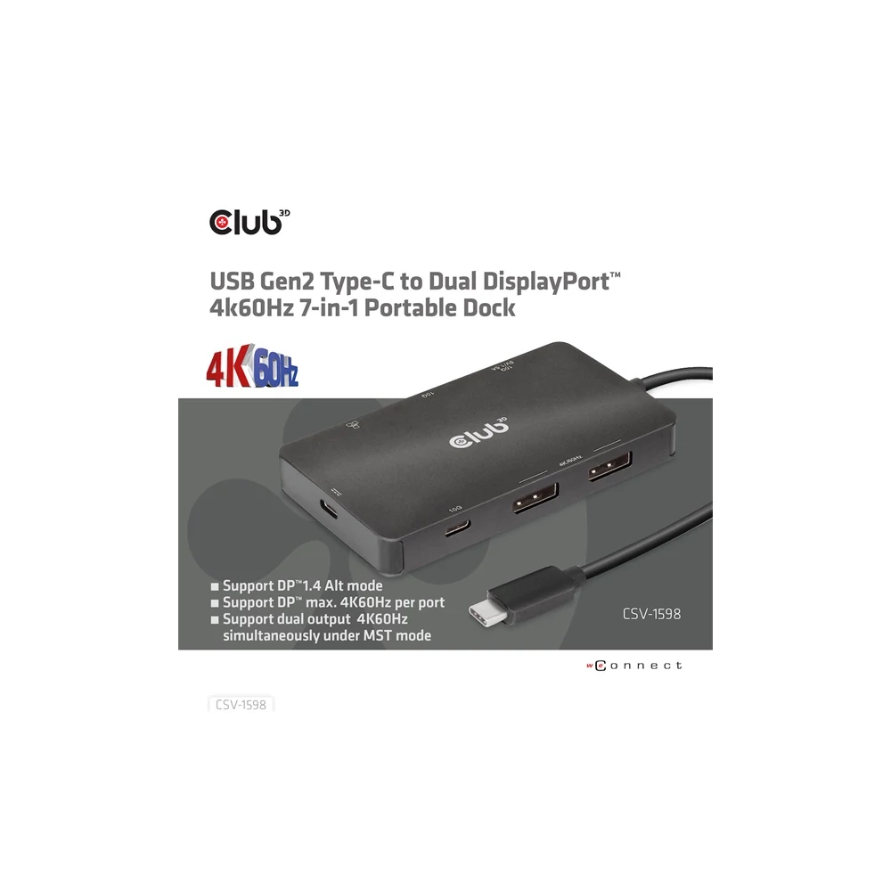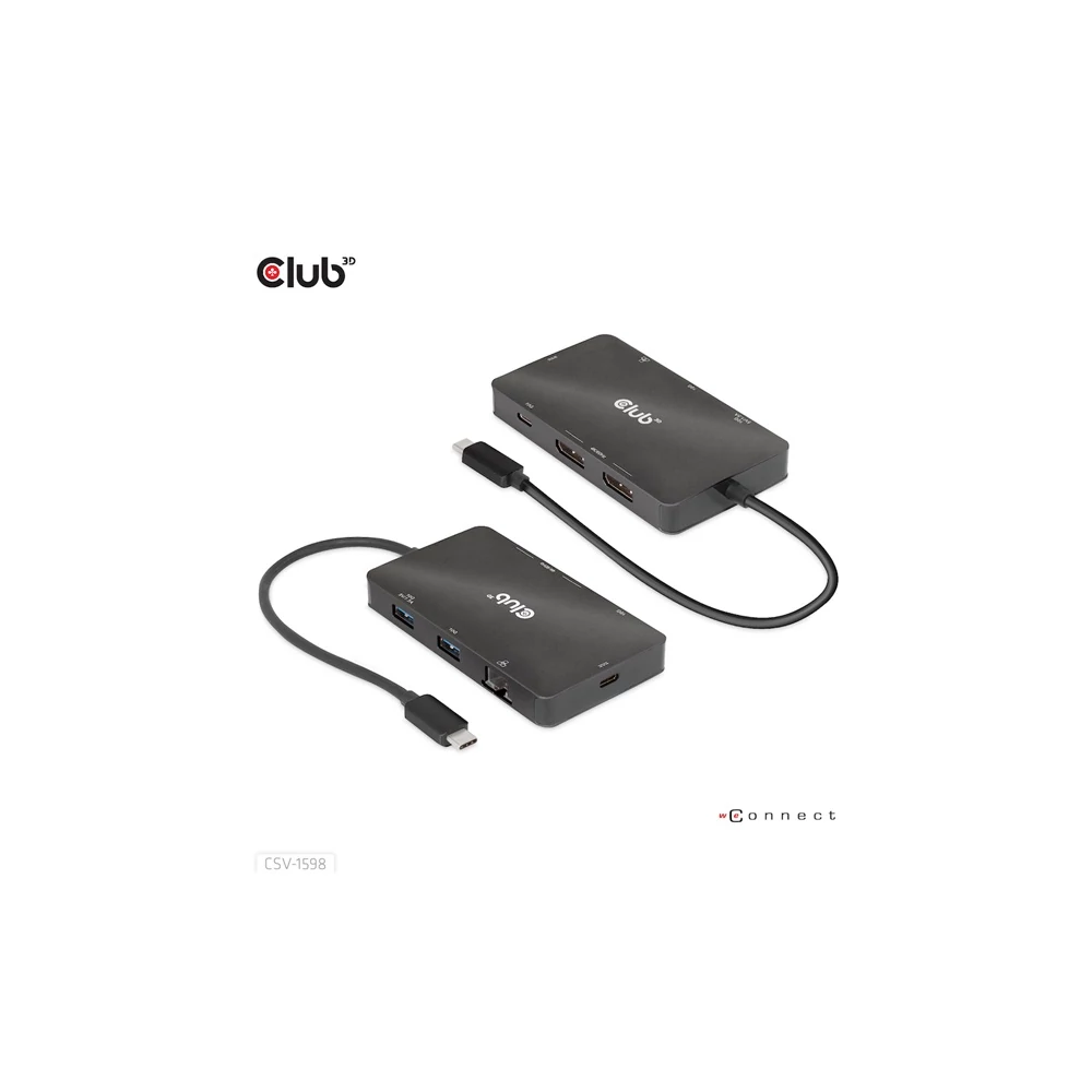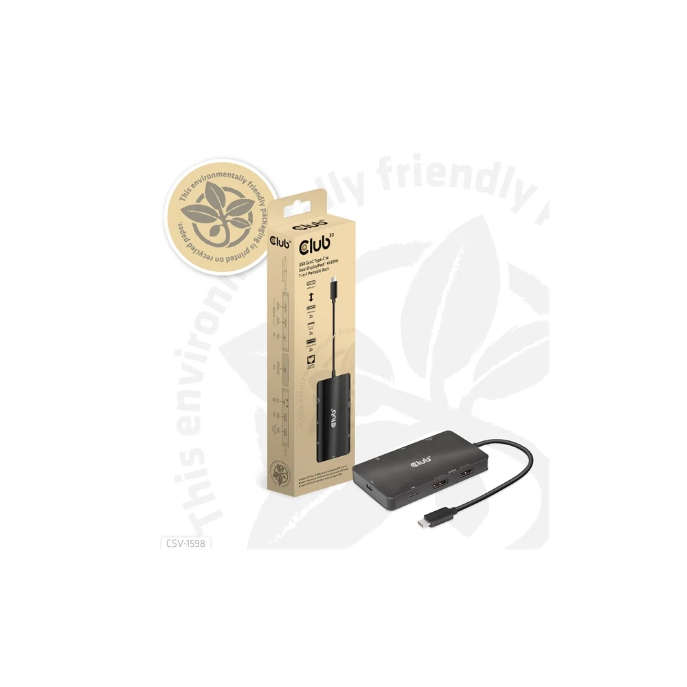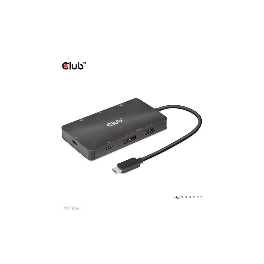 A Club 3D CSV-1598 egy 7 az 1-ben USB Gen2 Type-C és Dual Display hordozható dokkoló DP™1.4 Alt móddal, amely a legfejlettebb, leghatékonyabb megoldást kínálja egyetlen C típusú USB port több porttá bővítésére. Integrálja a videó-, adat- és tápcsatlakozókat, amelyek lehetővé teszik 2 DisplayPort™ 4k60 Hz-es kijelző egyidejű csatlakoztatását a videók nagy képernyőn való nézéséhez, több USB-eszköz csatlakoztatását adatátvitelhez, Ethernet-forrás csatlakoztatását a számítógép szupergyors hálózathoz való csatlakoztatásához. Ezenkívül PD töltőporttal rendelkezik, amely támogatja a maximum 100 W-os PD töltést, hogy támogassa az adapter funkcióját és egyidejűleg töltse fel a gazdagépet. Minden DP™ Alt móddal támogatott USB Type-C gazdagépen működik.