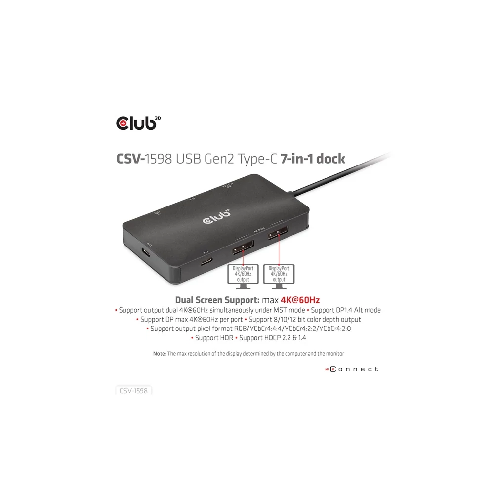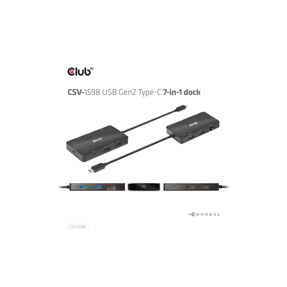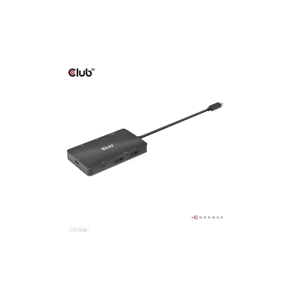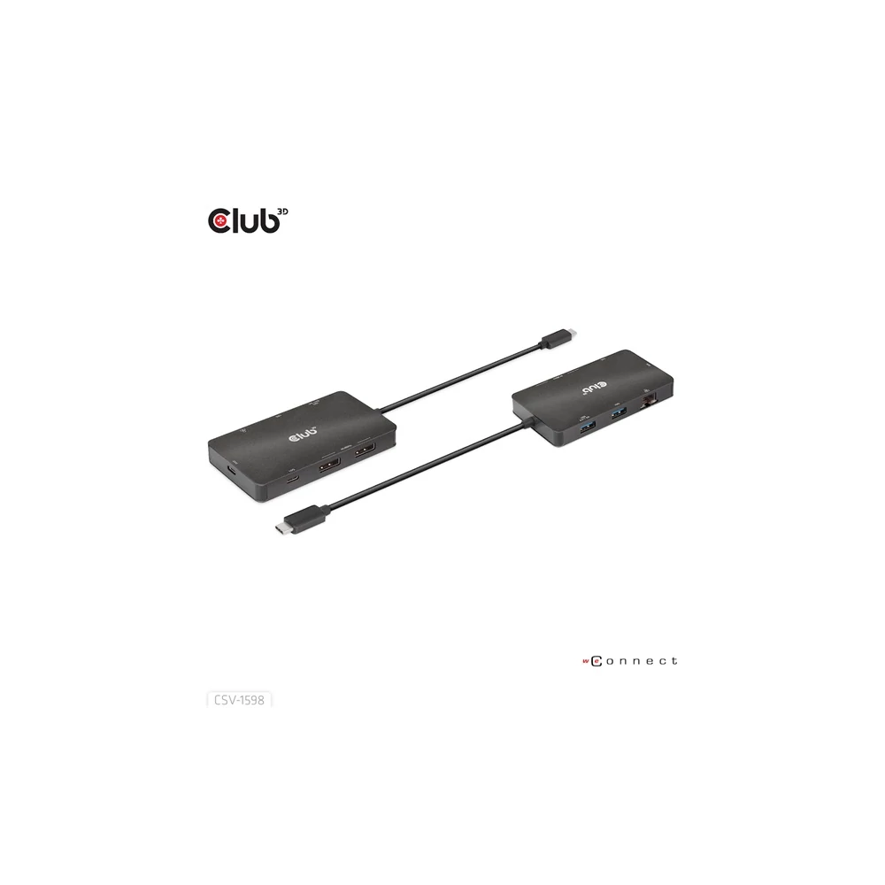 A Club 3D CSV-1598 egy 7 az 1-ben USB Gen2 Type-C és Dual Display hordozható dokkoló DP™1.4 Alt móddal, amely a legfejlettebb, leghatékonyabb megoldást kínálja egyetlen C típusú USB port több porttá bővítésére. Integrálja a videó-, adat- és tápcsatlakozókat, amelyek lehetővé teszik 2 DisplayPort™ 4k60 Hz-es kijelző egyidejű csatlakoztatását a videók nagy képernyőn való nézéséhez, több USB-eszköz csatlakoztatását adatátvitelhez, Ethernet-forrás csatlakoztatását a számítógép szupergyors hálózathoz való csatlakoztatásához. Ezenkívül PD töltőporttal rendelkezik, amely támogatja a maximum 100 W-os PD töltést, hogy támogassa az adapter funkcióját és egyidejűleg töltse fel a gazdagépet. Minden DP™ Alt móddal támogatott USB Type-C gazdagépen működik.