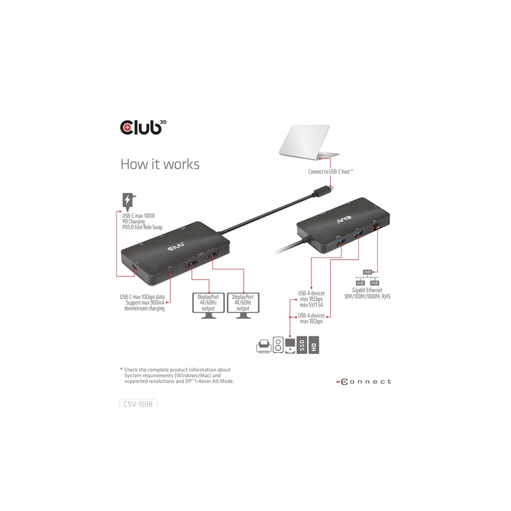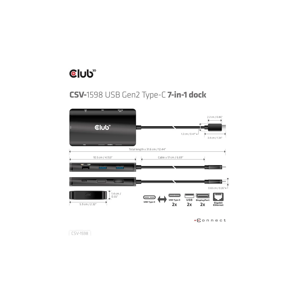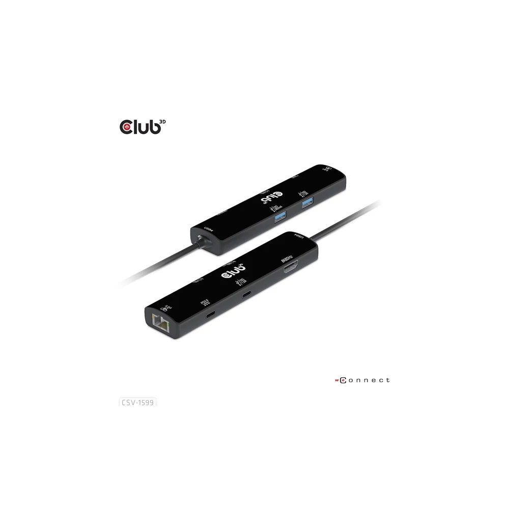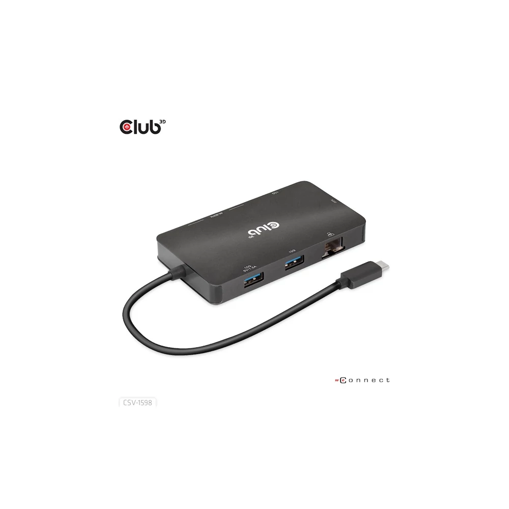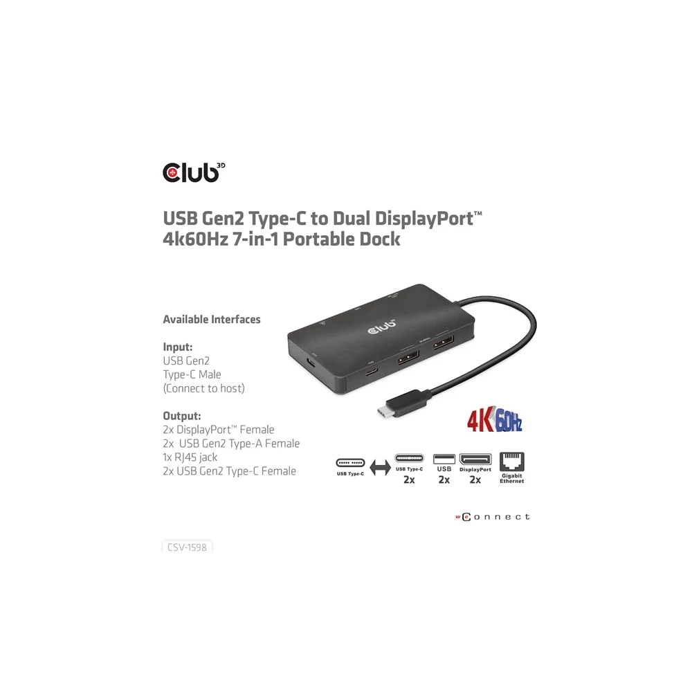 A Club 3D CSV-1598 egy 7 az 1-ben USB Gen2 Type-C és Dual Display hordozható dokkoló DP™1.4 Alt móddal, amely a legfejlettebb, leghatékonyabb megoldást kínálja egyetlen C típusú USB port több porttá bővítésére. Integrálja a videó-, adat- és tápcsatlakozókat, amelyek lehetővé teszik 2 DisplayPort™ 4k60 Hz-es kijelző egyidejű csatlakoztatását a videók nagy képernyőn való nézéséhez, több USB-eszköz csatlakoztatását adatátvitelhez, Ethernet-forrás csatlakoztatását a számítógép szupergyors hálózathoz való csatlakoztatásához. Ezenkívül PD töltőporttal rendelkezik, amely támogatja a maximum 100 W-os PD töltést, hogy támogassa az adapter funkcióját és egyidejűleg töltse fel a gazdagépet. Minden DP™ Alt móddal támogatott USB Type-C gazdagépen működik.