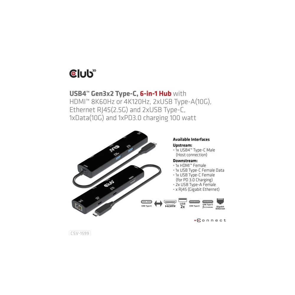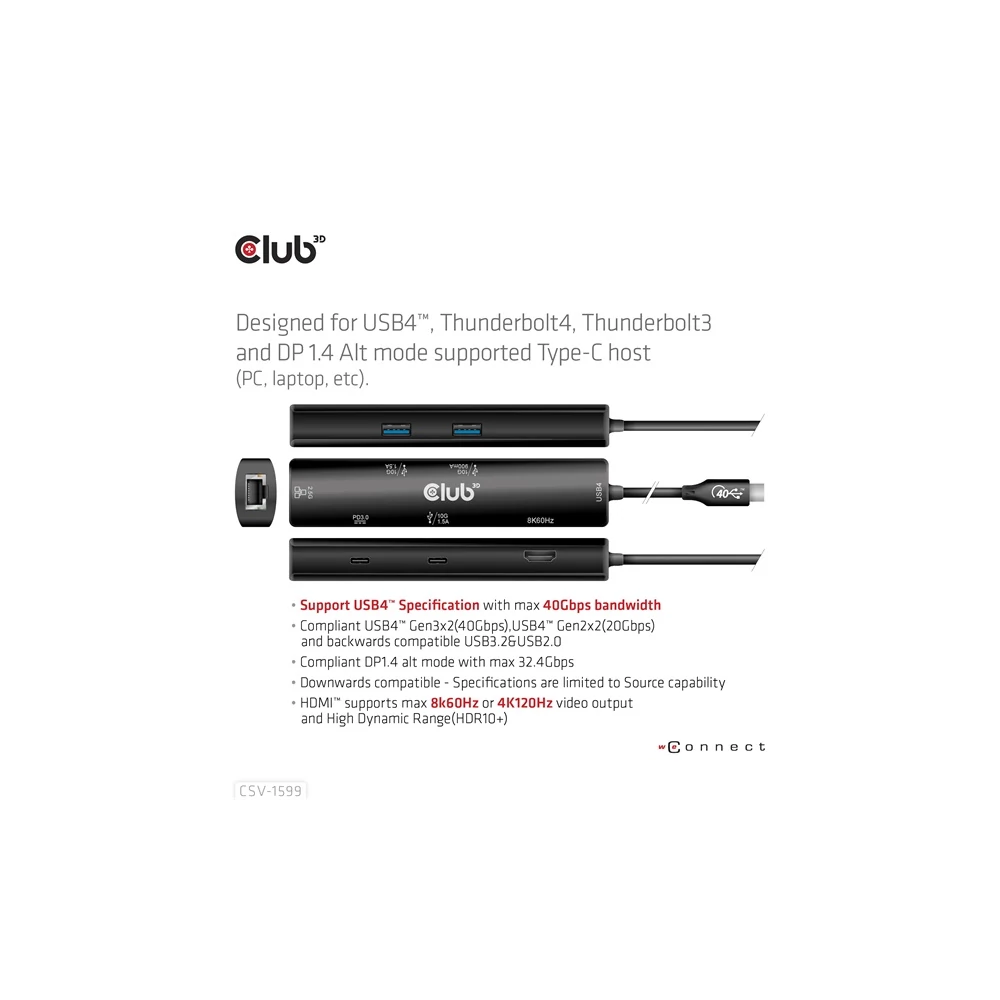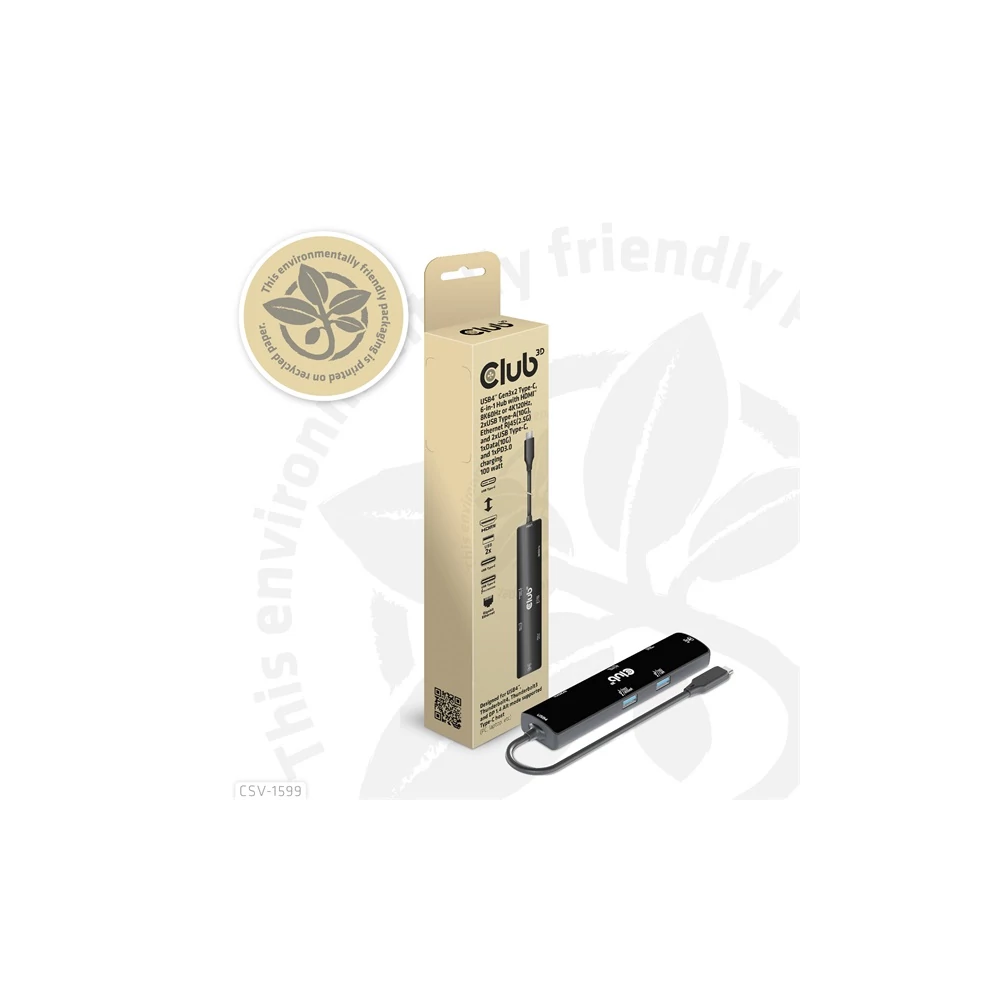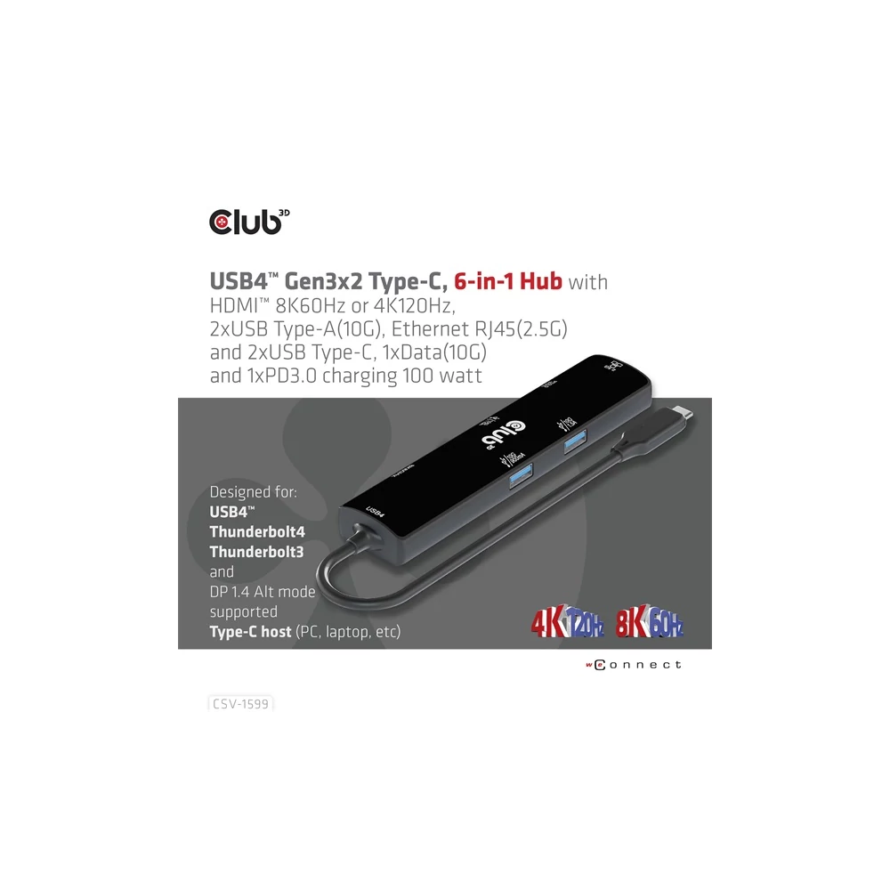 A Club 3D CSV-1599 egy USB4™ Gen3x2 Type-C, 6 az 1-ben hub HDMI™ 8K60Hz vagy 4K120Hz, 2xUSB Type-A (10G), Ethernet RJ45 (2.5G) és 2xUSB Type-C, 1x adatátvitel (10 PD3) és 1x adatátvitel (10G) integrált megoldást kínál videó, adat, tápellátás és Ethernet számára. HDMI™ (8K60Hz) csatlakozóval rendelkezik a videoátvitelhez, 3 USB adatporttal (2 USB-A 10G, 1 Type-C 10G) az adatátvitelhez, valamint egy 2,5 Gbps-os Ethernet-porttal az online szörfözéshez. Ezenkívül ez az adapter Type-C PD3.0 töltőporttal rendelkezik, maximum 100 W-os tápegységgel. Működhet USB4™, Thunderbolt4, Thunderbolt3 és DP Alt módban (15 W a termék működését szolgálja, a maradék teljesítmény (max. 85 W) a gazdagép töltésére kerül. Ez a 6 az 1-ben hub minden DP Alt móddal támogatott Type-C gazdagépen működik.