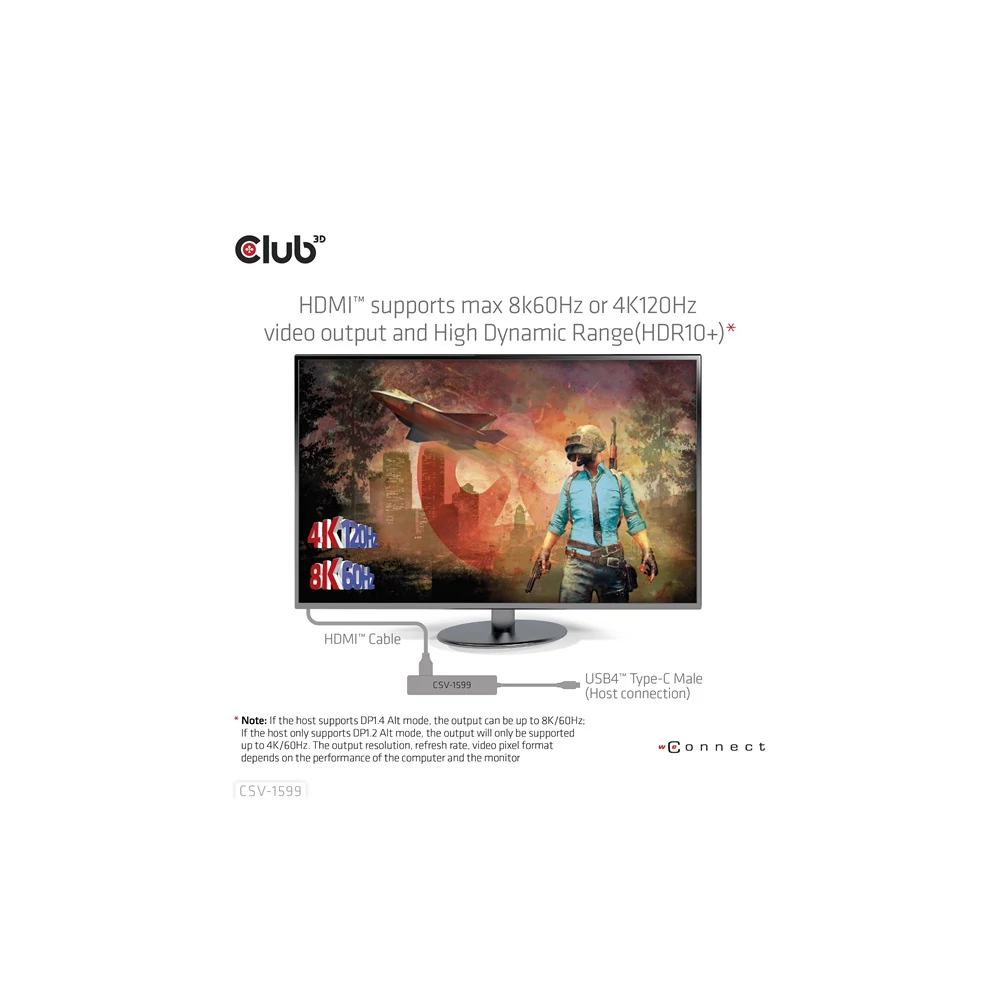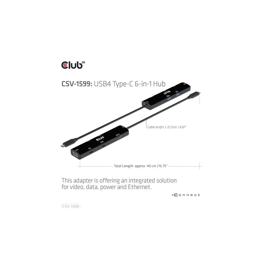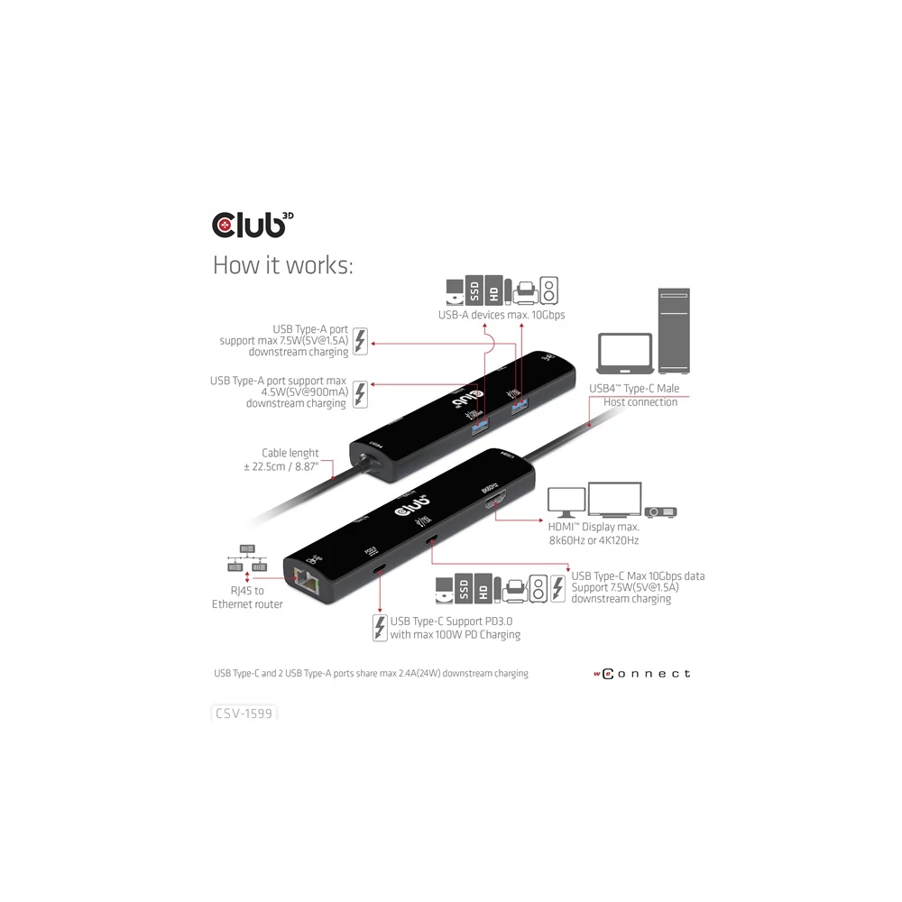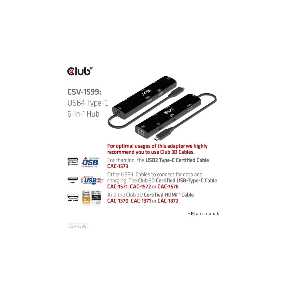 A Club 3D CSV-1599 egy USB4™ Gen3x2 Type-C, 6 az 1-ben hub HDMI™ 8K60Hz vagy 4K120Hz, 2xUSB Type-A (10G), Ethernet RJ45 (2.5G) és 2xUSB Type-C, 1x adatátvitel (10 PD3) és 1x adatátvitel (10G) integrált megoldást kínál videó, adat, tápellátás és Ethernet számára. HDMI™ (8K60Hz) csatlakozóval rendelkezik a videoátvitelhez, 3 USB adatporttal (2 USB-A 10G, 1 Type-C 10G) az adatátvitelhez, valamint egy 2,5 Gbps-os Ethernet-porttal az online szörfözéshez. Ezenkívül ez az adapter Type-C PD3.0 töltőporttal rendelkezik, maximum 100 W-os tápegységgel. Működhet USB4™, Thunderbolt4, Thunderbolt3 és DP Alt módban (15 W a termék működését szolgálja, a maradék teljesítmény (max. 85 W) a gazdagép töltésére kerül. Ez a 6 az 1-ben hub minden DP Alt móddal támogatott Type-C gazdagépen működik.