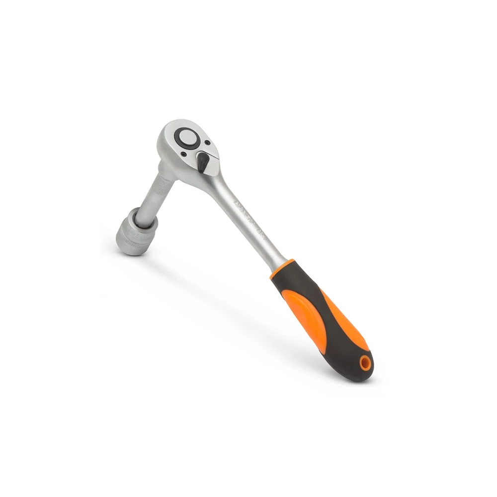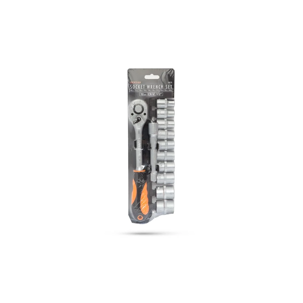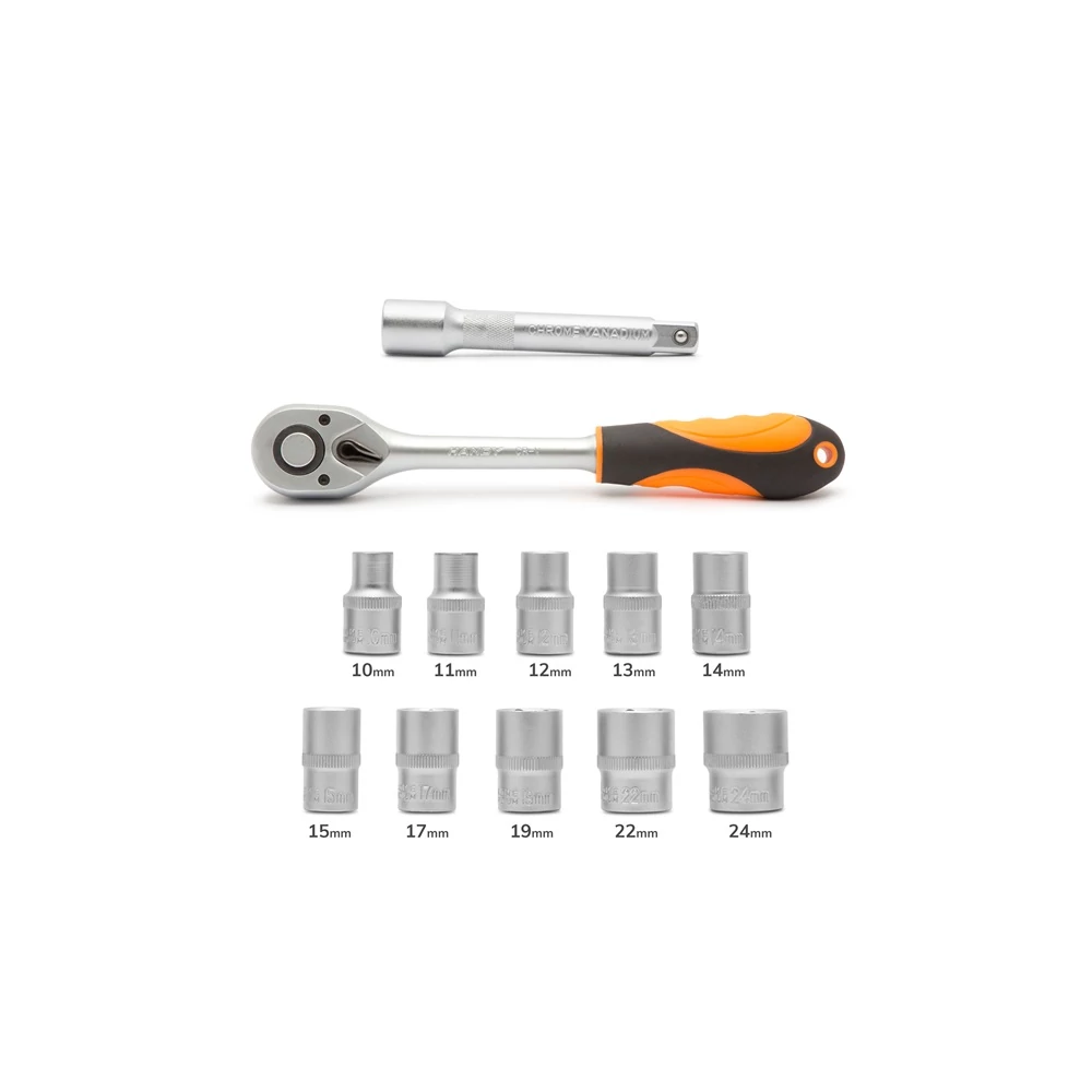 12 darabos racsnis dugókulcs készlet. 10 mm-es fejtől 22 mm-es fejig. A gumírozott nyél kényelmes fogást biztosít, a kompakt méretnek és a toldóelemnek köszönhetően nehezen hozzáférhető, kis helyeken is könnyen használható.