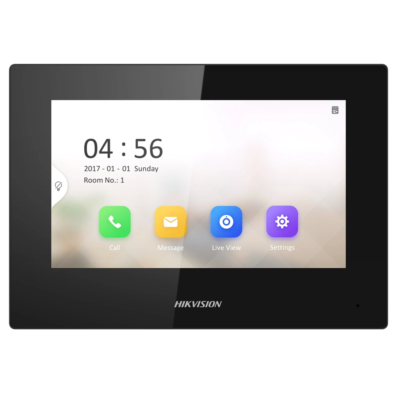 Standard PoE 7-inch colorful non-touch screen with resolution 1024 × 600 Views live video of door stations and linked cameras Black color