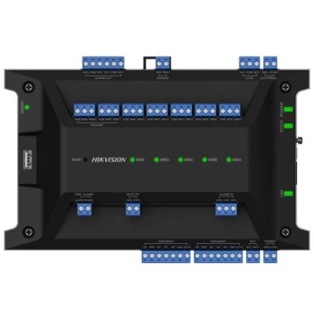 | Egyajtós beléptető vezérlő modul, 126 ajtó vezérlésig bővíthető DS-K2M002X bővítő modullal (max. 62), 2db Wiegand és 2db RS485 olvasó bemenet (belső-külső olvasó), 4db RS485 interfész további bővítő modulok részére (max. 16 modul interfészenként) és 1db RS485 redundáns, Bemenetek: 1db nyitásérzékelő, 1db nyitógomb bemenet, 1db szabotázs bemenet; 1db ajtózár vezérlő relé kimenet, 2 riasztás bemenet, 2 riasztás relé kimenet. Kommunikációs csatlakozás TCP/IP; RS-485/Wiegand(26/34), 100 000 felhesználó, 200 000 kártya, 10 000 ujjlenyomat és 600 000 esemény tárolása, 12VDC - a vezérlő opcionális akkumulátorral szünetmentesíthető | |