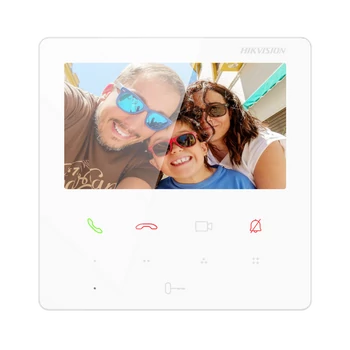 4.3-inch színes kijelző, 480 × 272 felbontás PoE tápellátás Hik-Connect APP támogatás Élő kép ajtó állomásról és kamerákról 4 állítható funkció gomb Fehér
