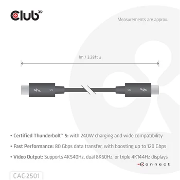 Thunderbolt™ 5 tanúsítvánnyal rendelkező 8K240 Hz adat 80/120 Gbps EPR 240 Watt Kábel M/M 1 m / 3,28 láb • NAGY TELJESÍTMÉNY: 1 m / 3,28 láb Thunderbolt™ 5 kábel 80 Gbps, 8K videót és 240 W EPR teljesítményt támogat; Az USB Type-C® – Type-C® csatlakozók univerzális kompatibilitást biztosítanak a Thunderbolt™ 3 és 4, USB80Gbps és más USB Type-C® eszközökkel • THUNDERBOLT TANÚSÍTVÁNY: Intel Thunderbolt™ tanúsítvánnyal rendelkezik a Thunderbolt™ gazdagépekkel és eszközökkel való garantált kompatibilitás érdekében; A DisplayPort™ 2.1 DSC-vel akár 4K540Hz-ig vagy kettős 8K240Hz-ig támogat; Kompatibilis a PCI Express 64 Gbps-mal külső PCIe eszközökhöz • MINŐSÉGI FELÉPÍTÉS: Nikkelezett csatlakozók PVC tehermentesítővel a tartósság érdekében; Sodrott érpárú vezeték fonott ötvözet pajzssal a fokozott EMI-védelem érdekében; A tartós TPE külső köpeny környezetbarát, nem mérgező, halogénmentes és RoHS-kompatibilis • ALKALMAZÁSOK: Sokoldalú csatlakoztathatóság Thunderbolt™ 5 és USB Type-C® laptopokkal, iPad Pro (5. generációs és újabb), dokkolóállomásokkal, 4K/8K monitorokkal, külső PCIe házzal és tárolómeghajtókkal; Alacsony késleltetésű teljesítmény Thunderbolt™ 5 hálózati 64 Gbps-sel és audioeszközökkel • MELLÉKLET: 1 m / 3,28 láb; Fekete; Thunderbolt™ 5 (80/120 Gbps); USB 80 Gbps és alacsonyabb verziók; DisplayPort™ 2.1 DSC-vel; 8K240Hz vagy Dual 4K144Hz; PCIe 64 Gbps; 240W PD; Sodrott érpárú kábel külső átmérője: 4,8 mm / 0,19 hüvelyk Műszaki adatok Támogatott felbontások: *JEGYZET: OS támogatás: A dobozban: Bemenet: Egyéb információ: Megjegyzések: A Club 3D környezetbarát csomagolást használ, és újrahasznosított papírra nyomtatják. |