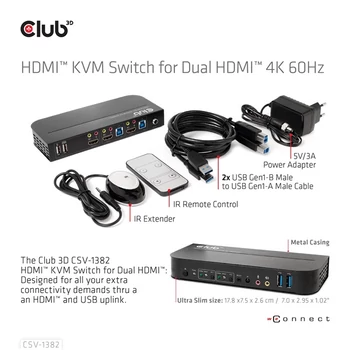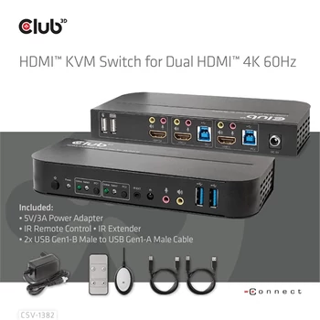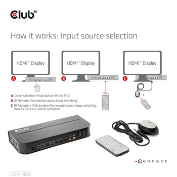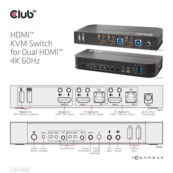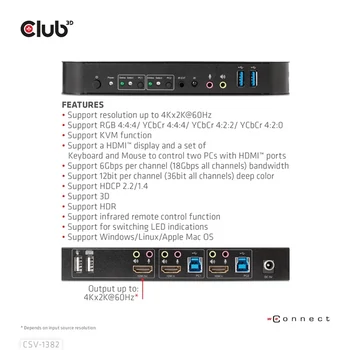 | HDMI™ KVM Switch for Dual HDMI™ 4K 60Hz Támogatott felbontás: akár 4Kx2K@60Hz RGB 4:4:4, YCbCr 4:4:4, YCbCr 4:2:2, YCbCr 4:2:0 támogatás KVM funkció támogatás HDMI™ kijelző és egy billentyűzet/egér segítségével két HDMI™ portos számítógép vezérlése Sávszélesség: 6Gbps csatornánként (összesen 18Gbps) 12bit csatornánként, 36bit minden csatorna mély szín támogatása HDCP 2.2/1.4 támogatás 3D és HDR támogatás Infravörös távirányító funkció LED indikációk a váltáshoz Kompatibilis operációs rendszerek: Windows, Apple Mac OS Doboz tartalma: CSV-1382 HDMI™ KVM Kapcsoló x 1 Külső 5V 3A tápegység x 1 Infravörös távirányító x1 IR kiterjesztő x1 USB B típusú férfi és A típusú férfi kábel x2 Gyors telepítési útmutató Csatlakozók: Bemenet: PC 1: HDMI™ + USB + Mic + Stereo Port, PC 2: HDMI™ + USB + Mic + Stereo Port, 3.5mm Mikrofon bemenet, DC 5V - Tápellátás Kimenet: 1x HDMI™ Női, 1x MIC, 1x Sztereó Jack, 1x USB Egér kapcsolat, 1x USB Billentyűzet kapcsolat, 3.5mm Sztereó port Egyéb infó: Doboz mérete: 23 x 21 x 6.5 cm Eszköz mérete: 17.8 x7.5 x 2.6 cm Doboz súlya: 147 gr Eszköz súlya: 365 gr Teljes súly: 783 gr ROHS, FCC, és CE EMI követelményeknek megfelel Termékoldal | |