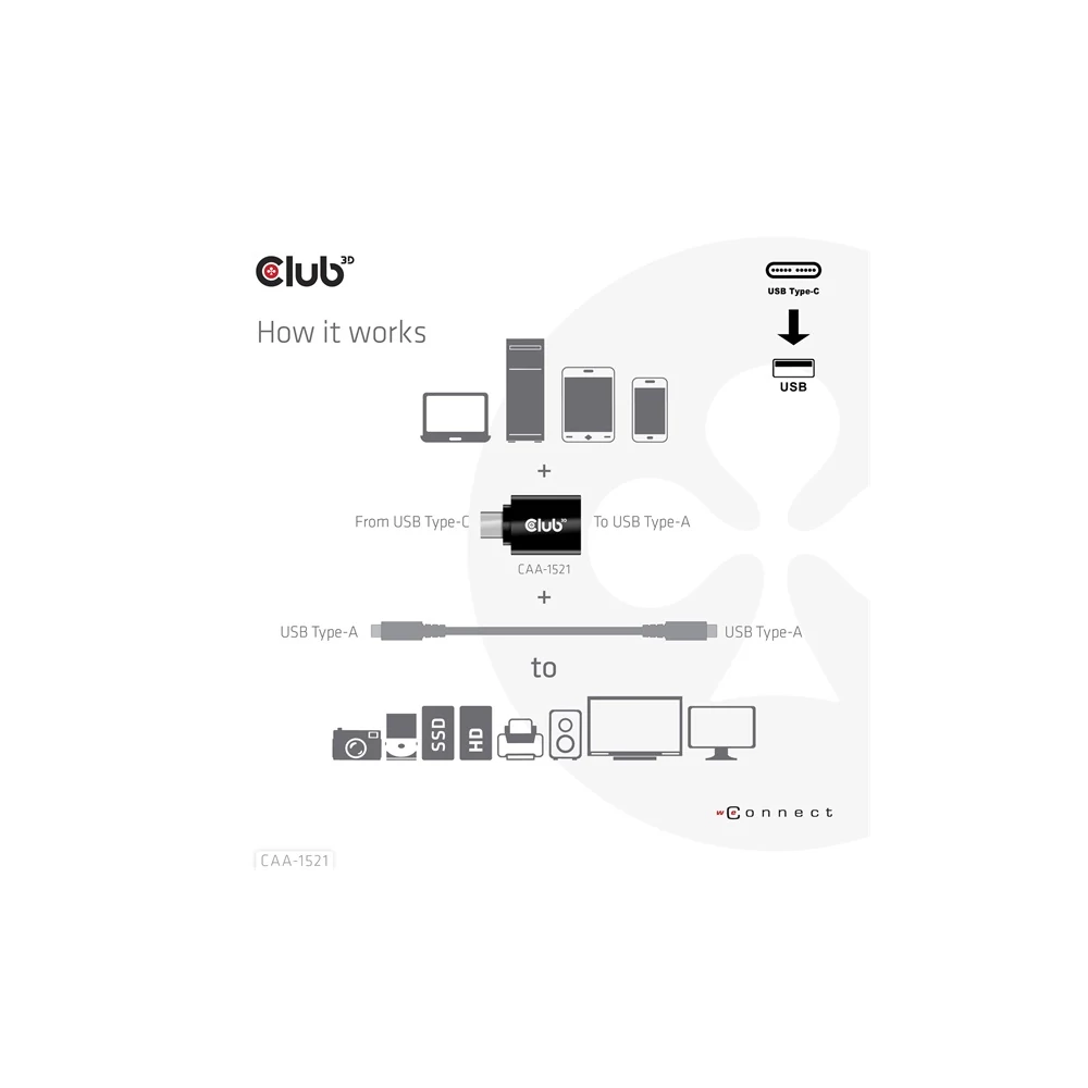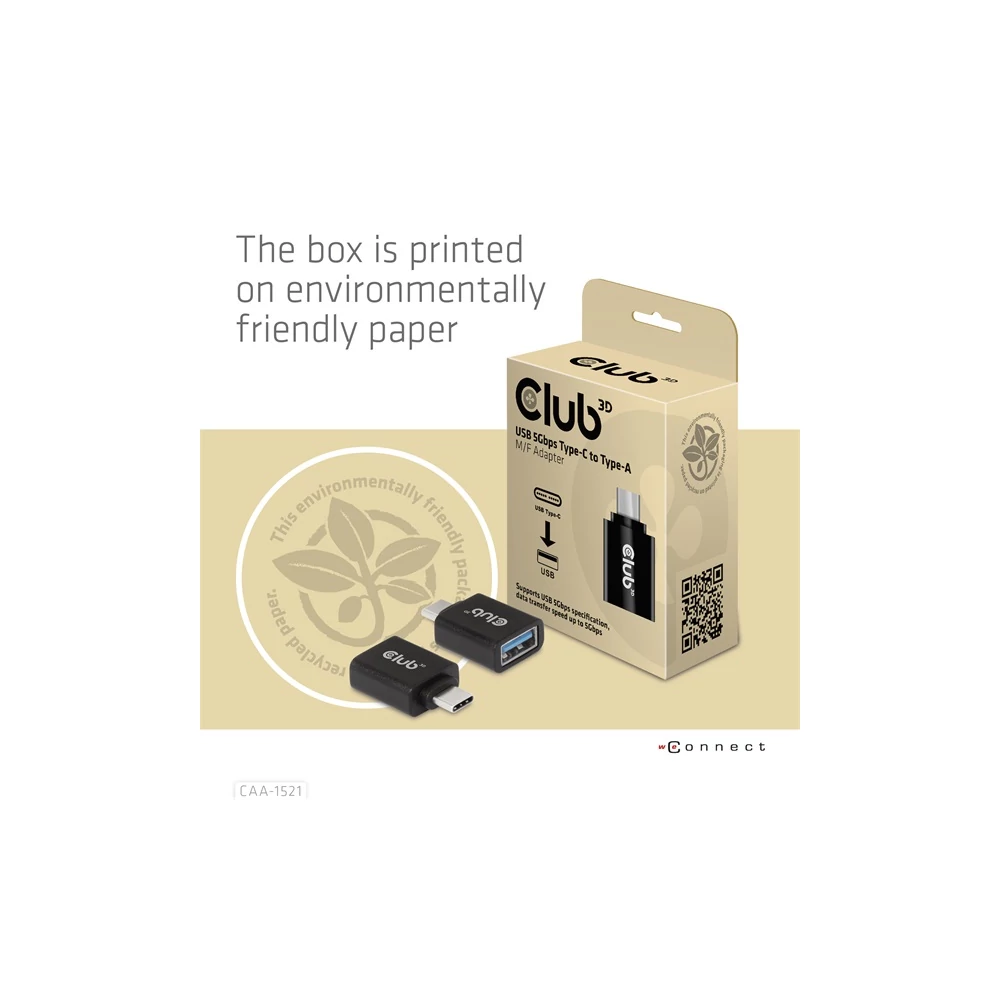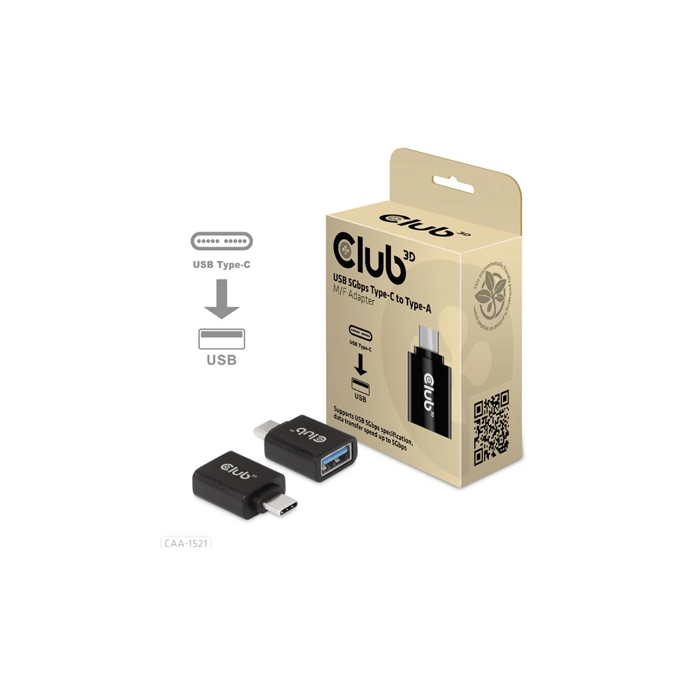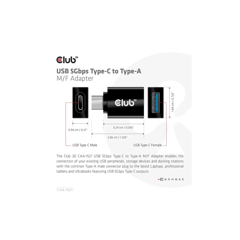 A Club 3D CAA-1521 USB 5Gbps Type-C-A Type-A M/F adapter lehetővé teszi a meglévő USB-perifériák, tárolóeszközök és dokkolóállomások csatlakoztatását a közös Type-A dugós dugóval a legújabb laptopokhoz, professzionális táblagépekhez és Ultrabookokhoz, amelyek USB 5Gbps Type-C kimenettel rendelkeznek.