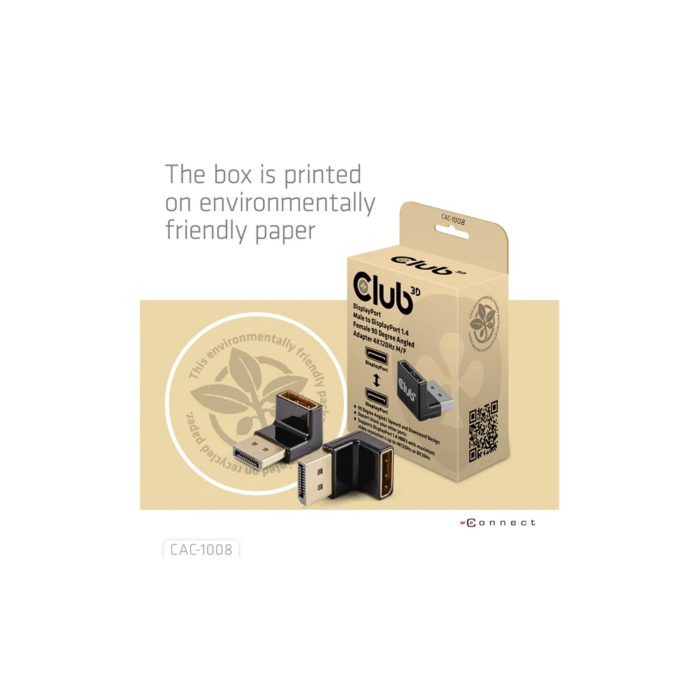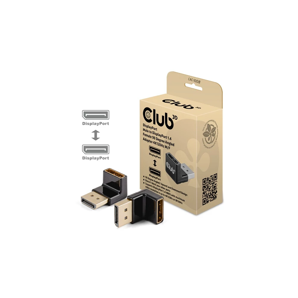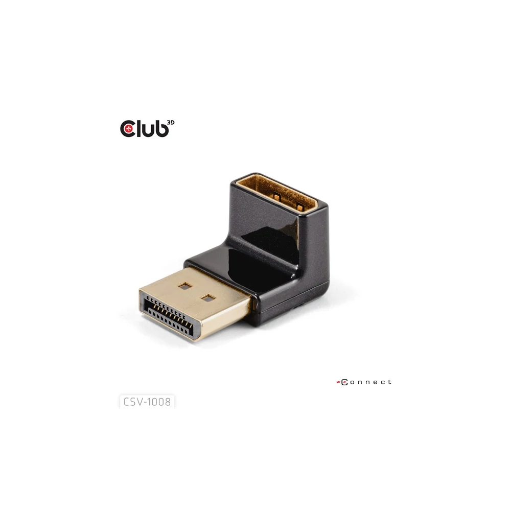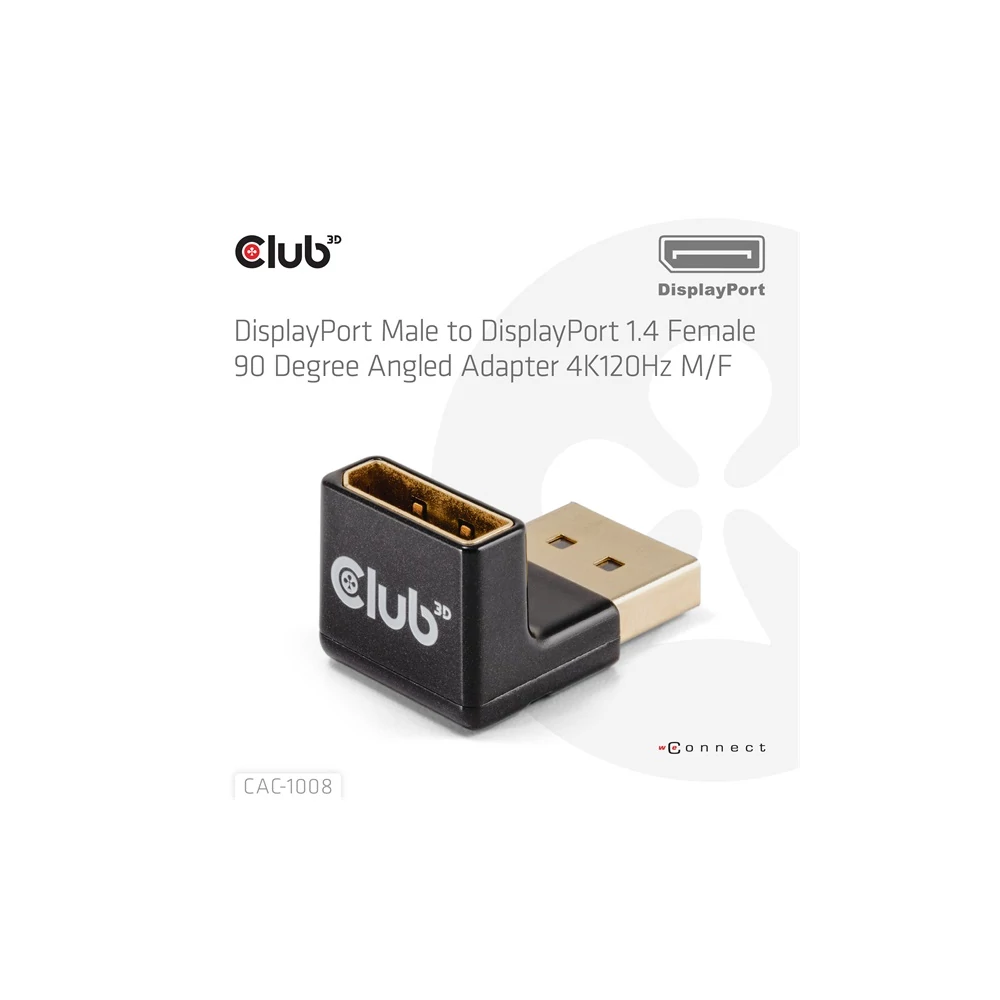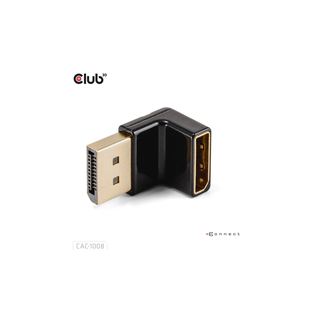A Club 3D CAC-1008 DisplayPort Férfi-Női 90 fokos szögű adapter 4K120Hz M/F sokoldalú szögcsatlakozó adapter, amely kábelkezelési megoldásokat kínál. Segítségével elkerülhető, hogy más portokat lezárjanak a gazda eszközön. Különösen a szoros elhelyezésű DisplayPort bemeneteknél nyújt megoldást, hogy ne zárja le a másik portokat vagy ne hajlítsa meg a kábeleket. A csomag egy adaptert tartalmaz, univerzálisan használható, támogatja a legfeljebb 4096*2160 felbontást 120Hz-en vagy 7680*4320 felbontást 30Hz-en. Az adapterek ellenőrzöttek, hogy támogatják a Club 3D termékekkel való használatot is. Fontos, hogy a forrás és a megjelenítő támogassa a DP1.4-et, és a kábelek is ezzel a sávszélességgel legyenek tervezve. További információk a tulajdonságokról és támogatott OS-emekről a weblinken: Termékinformáció Funkciók: • 90 fokos szög / felfelé és lefelé hajlítva • Egyszerűen csatlakoztatható a gazda kábelhez • Nem zárja el a többi portot • Támogatja a DisplayPort 1.4 HBR3-at maximum 4K120Hz-es vagy 8K30Hz-es felbontásban • Támogatja a DisplayPort 1.4-et és lefelé kompatibilis a régebbi verziókkal • Átvitel sebessége 16.2Gbps /2.7 Gbps / 5.4Gbps / 8.1 Gbps • Minimális jelveszteség Támogatott felbontások: • Legfeljebb 4K120Hz vagy 8K30Hz OS Támogatás: • Minden Elérhető interfészek: Bemenet: • DisplayPort Férfi Kimenet: • DisplayPort Női Csomag tartalma: • CAC-1008 DisplayPort Férfi-Női 90 fokos szögű adapter 4K120Hz M/F További információk: • Doboz mérete: 6 x 7x 3.5 cm • DisplayPort Csatlakozó: 2.56 x 1.8 x 1.7 cm • Eszköz súlya: 13 gr • Doboz súlya: 34 gr • Biodegradációs zsák súlya: 5 gr • Teljes súly: 52 gr • Megfelel a ROHS, FCC és CE EMI követelményeknek Figyelem Biztonságos Használat - A termék csak 2000 méter/6562 láb magasság alatt használható. A Club 3D környezetbarát csomagolást használ, újrahasznosított papíron nyomtatva. A Club 3D bio-degradációs zsákokat használ az EN/DIN 13432 szerint. Kérjük használjon egy kiterjesztő/adapter kábelt az eszközéhez való csatlakozáshoz: Amennyiben segítségre van szüksége a megfelelő kábel kiválasztásához, kérjük lépjen velünk kapcsolatba a support@club-3d.com címen, örömünkre szolgál segíteni.