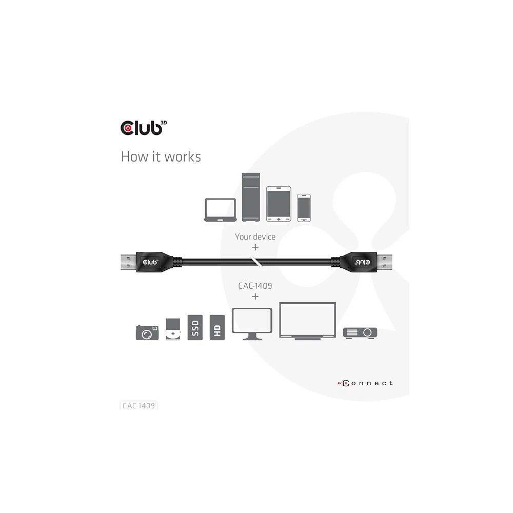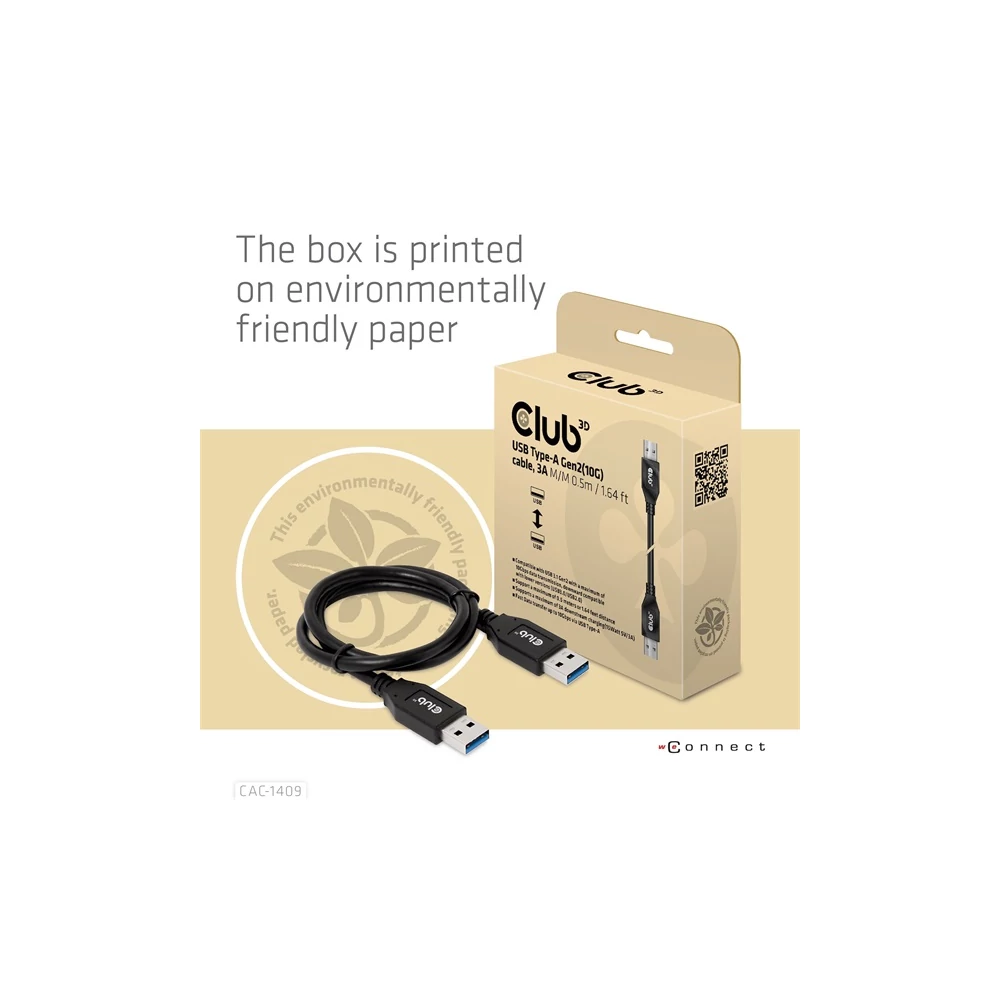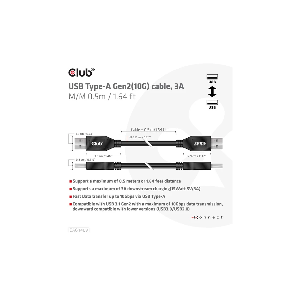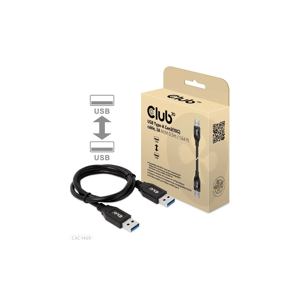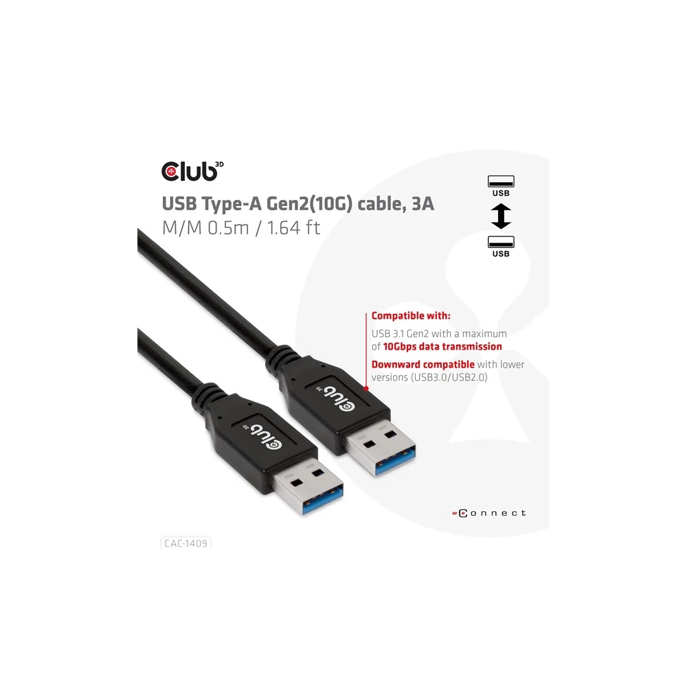 A Club 3D CAC-1409 USB Type-A Gen2(10G) kábel, 3A M/M egy 0,5 m hosszúságú USB Type-A kábel. Kompatibilis az USB 3.1 Gen 2-vel, maximum 10 Gbps adatátvitellel, és akár 15 watt lefelé irányuló töltést is támogat. Lefelé kompatibilis az alacsonyabb verziókkal, kérjük, vegye figyelembe, hogy a specifikációk a csatlakoztatott eszközre korlátozódnak.