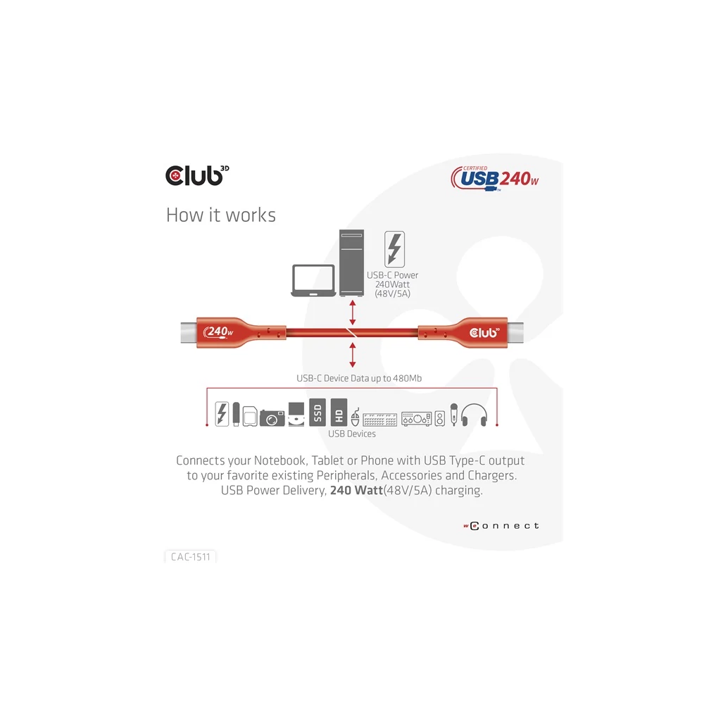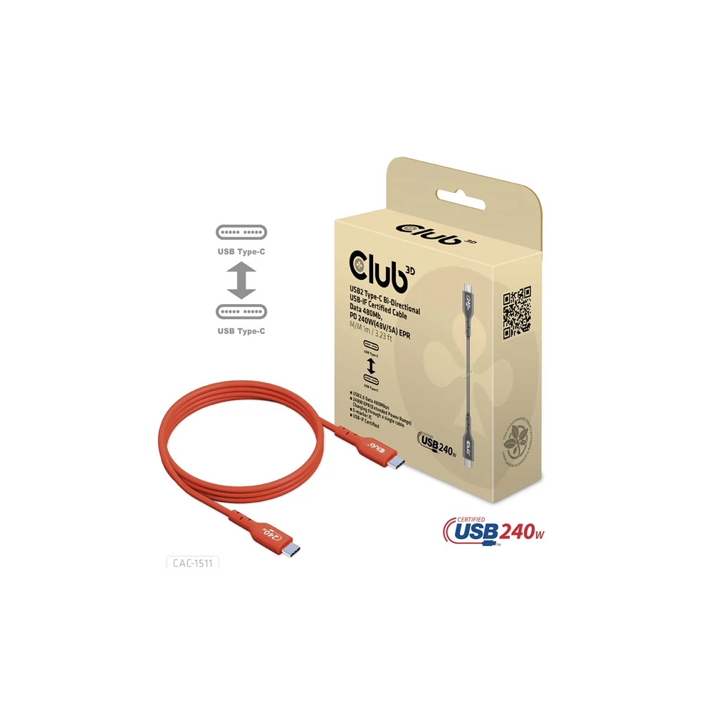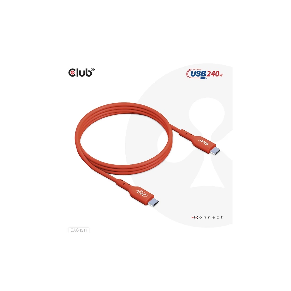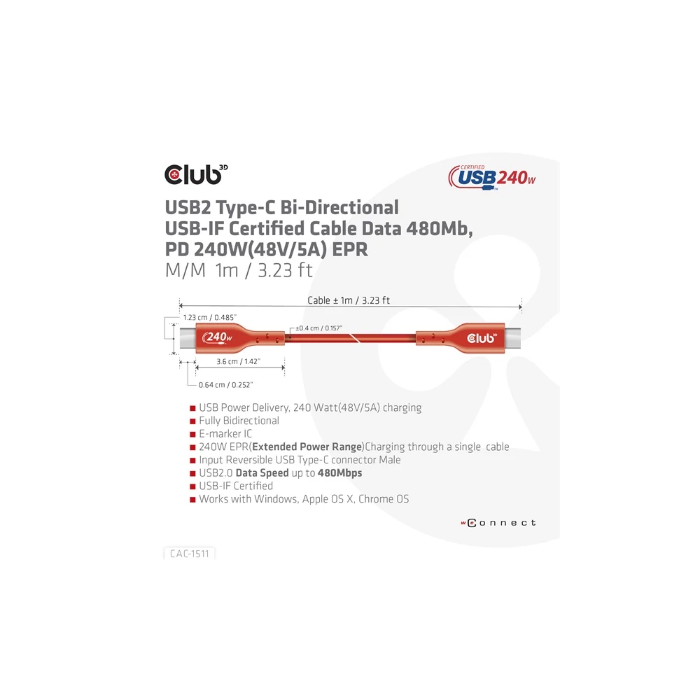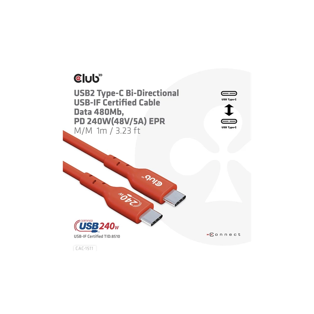 A Club 3D CAC-1511 USB2 Type-C kétirányú, USB-IF tanúsítvánnyal rendelkező kábel, amely 480Mb adatátviteli sebességet és 240W (48V/5A) EPR hálózatosítást biztosít. Specifikációk: • Termék sorozat: Kábelek • Termék kód: CAC-1511 • EAN kód: 8719214472627 • UPC kód: 841615102860 • USB-IF tanúsítvány TID: 8510 Jellemzők: • USB Power Delivery, 240 watt (48V/5A) töltés • Teljesen bidirekcionális • E-marker IC • 240W EPR (Extended Power Range) töltés egy kábel révén • Reverzibilis USB Type-C csatlakozó férfi • USB2.0 adatsebesség akár 480Mbps • USB-IF tanúsított • Windows, Apple OS X, Chrome OS kompatibilis Operációs rendszer támogatás: • Windows, Apple OS X, Chrome OS kompatibilis A csomag tartalma: • CAC-1511 USB2.0 Type-C kétirányú, USB-IF tanúsítvánnyal rendelkező kábel, adatátvitel 480Mb, PD 240W(48V/5A) EPR M/M 1m/3.23ft Elérhető interfészek: Bemenet: USB Type-C férfi Kimenet: USB Type-C férfi Egyéb információk: • Doboz mérete: 10 x 10 x 3.5 cm • Kábel teljes hossza kb.: 1 m • USB Type-C férfi csatlakozó méretei: 3.62 x 1.2 x 0.63 cm • Kábel súlya: 34 g • Doboz súlya: 22 g • Teljes súly: 56 g • ROHS, FCC és CE EMI előírásoknak megfelel Használjon egyik kiterjesztés/adatátviteli kábelünket eszközei csatlakoztatására: szükség esetén kérjük, keressen fel bennünket megfelelő kábel kiválasztásához a www.club-3d.com weboldalon vagy írjon a support@club-3d.com címre, örömmel segítünk. Kérjük, tekintse meg teljes áttekintésünket a Jogi feltételekről a www.club-3d.com oldalon. Link a gyártó termékoldalára