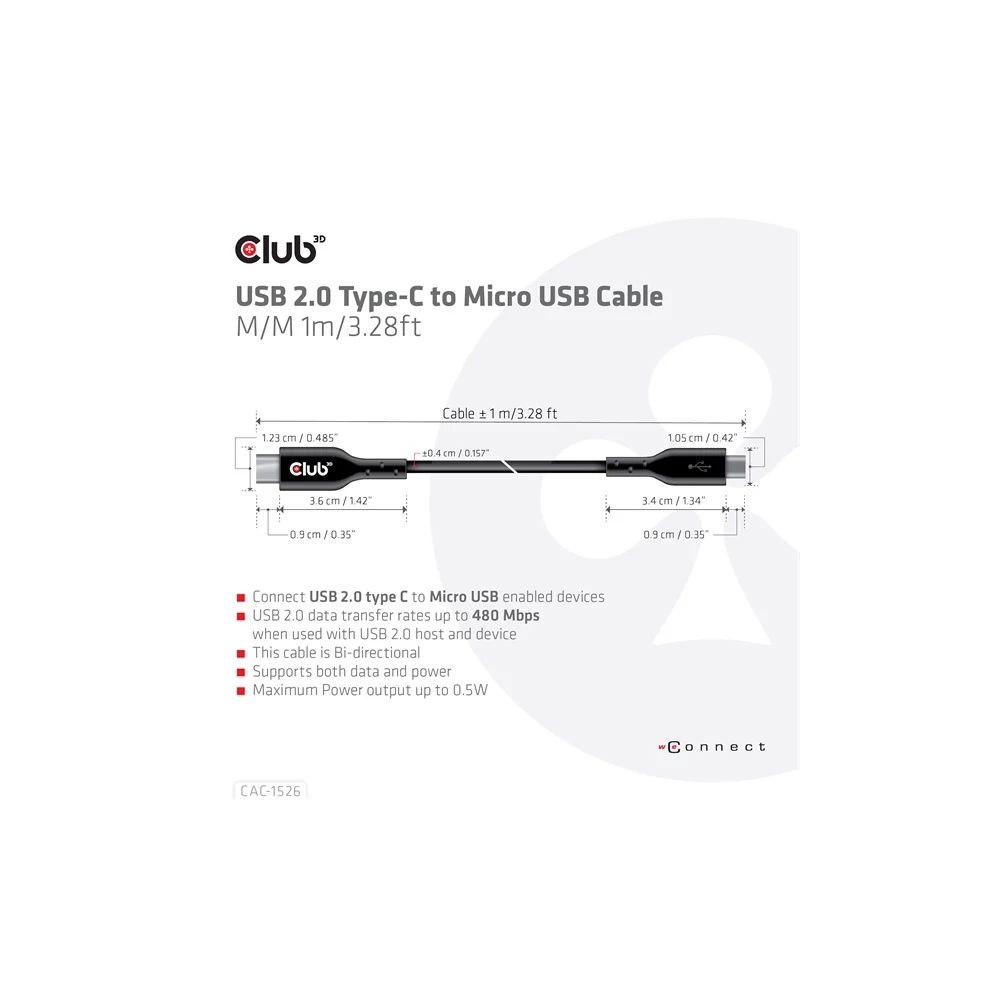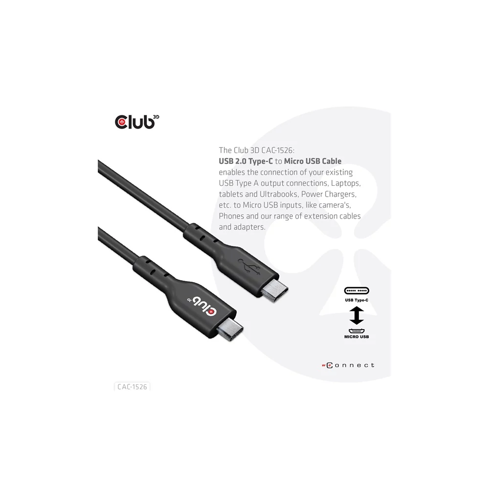 A Club 3D CAC-1526 USB 2.0 Type-C – Micro USB kábel lehetővé teszi a meglévő USB Type C kimeneti csatlakozások, laptopok, táblagépek és Ultrabookok, táptöltők stb. csatlakoztatását Micro USB bemenetekhez, például kamerákhoz, telefonokhoz, valamint hosszabbítókábeleink és adaptereinkhez.