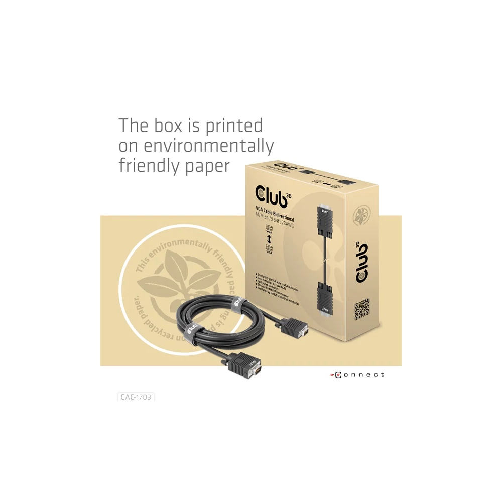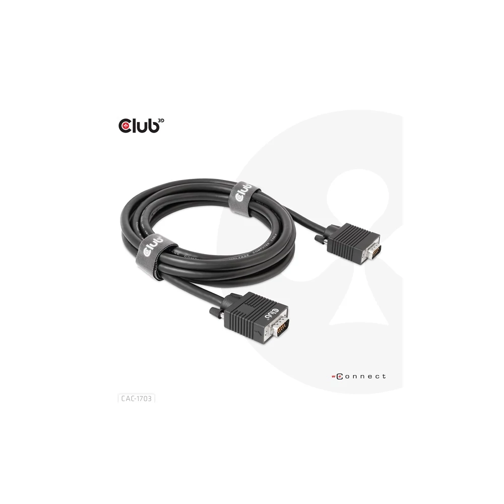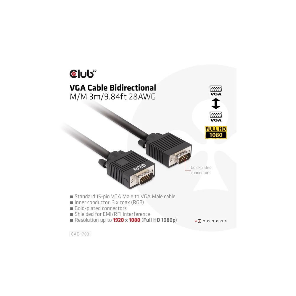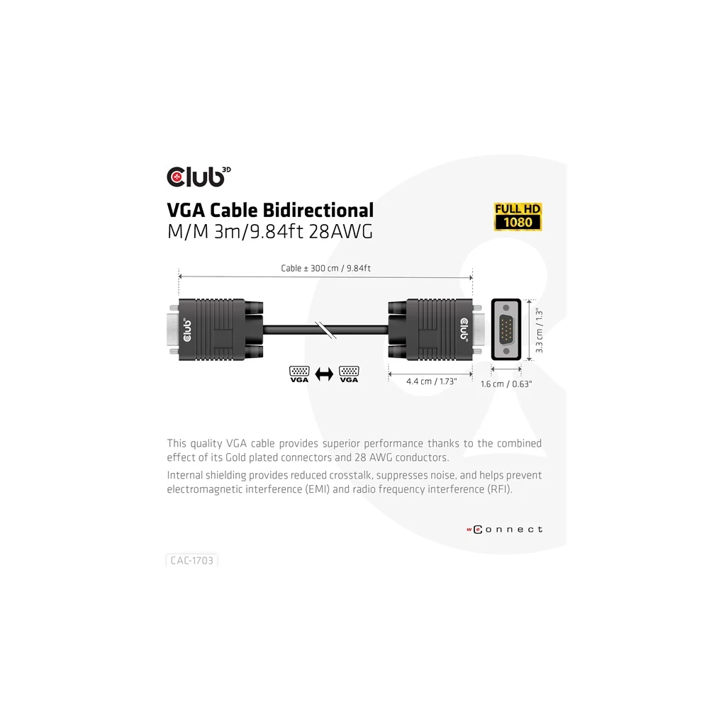 A Club 3D CAC-1703 VGA kétirányú M/M 3 m/9,84 láb 28 AWG kábel bármely VGA-val felszerelt asztali számítógépet, laptopot vagy adaptert monitorhoz, kijelzőhöz, sugárzóhoz vagy kivetítőhöz csatlakoztat egy 15 tűs VGA Female porttal. Ideális otthoni vagy munkahelyi használatra, a kábel megbízható kapcsolatot hoz létre bármihez, a játéktól a videovetítésig, és akár Full HD 1080p felbontást is támogat (max. 1920 x 1080 felbontás).