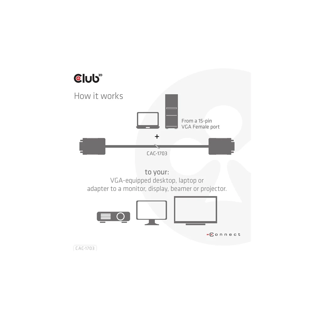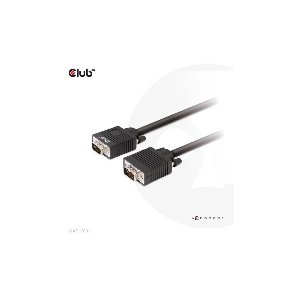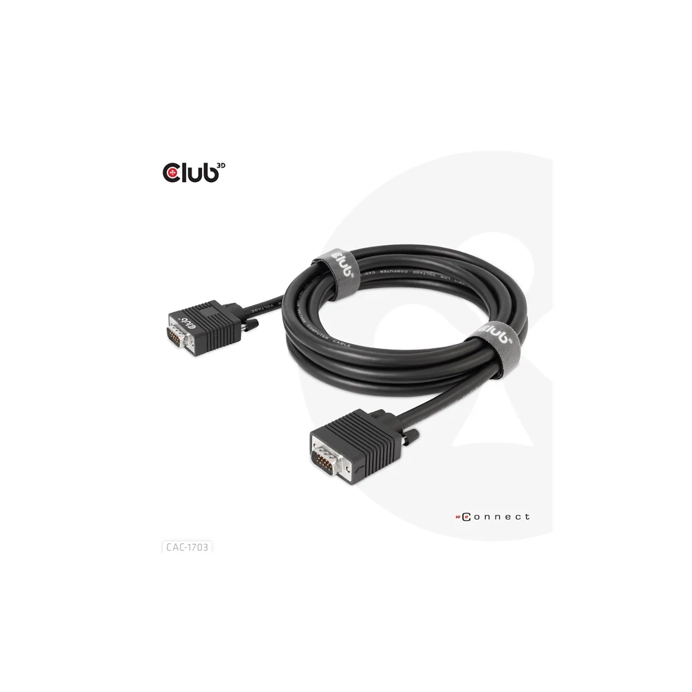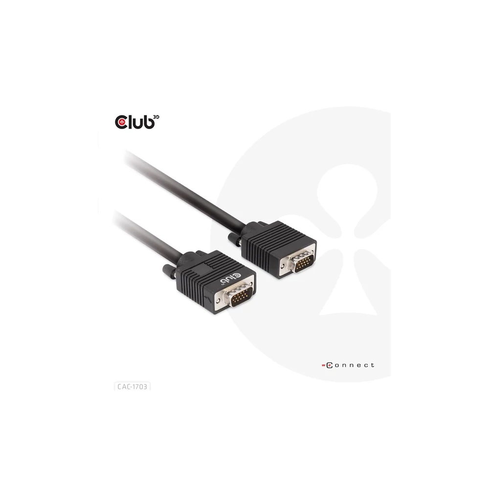 A Club 3D CAC-1703 VGA kétirányú M/M 3 m/9,84 láb 28 AWG kábel bármely VGA-val felszerelt asztali számítógépet, laptopot vagy adaptert monitorhoz, kijelzőhöz, sugárzóhoz vagy kivetítőhöz csatlakoztat egy 15 tűs VGA Female porttal. Ideális otthoni vagy munkahelyi használatra, a kábel megbízható kapcsolatot hoz létre bármihez, a játéktól a videovetítésig, és akár Full HD 1080p felbontást is támogat (max. 1920 x 1080 felbontás).