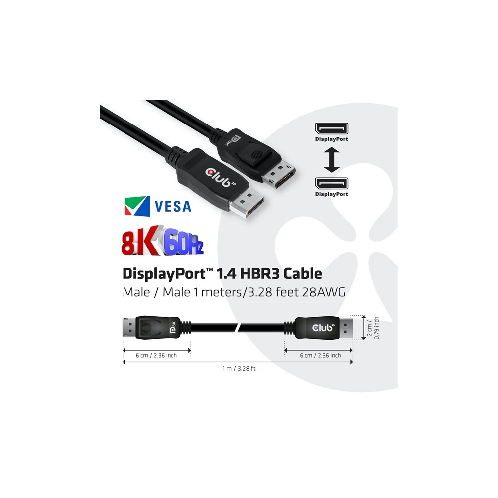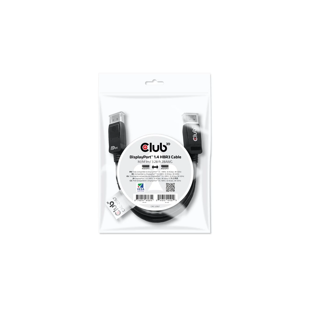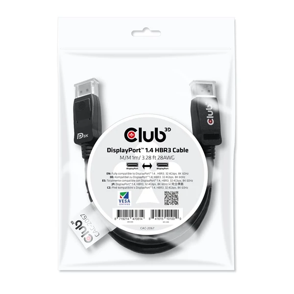A Club 3D CAC-2067 DisplayPort™ 1.4 HBR3 kábel lehetővé teszi a DisplayPort™ támogatott (Gaming) PC vagy laptop csatlakoztatását egy (Ultra) nagy felbontású monitorhoz vagy más DisplayPort™ támogatott eszközhöz. A DisplayPort™ 1.4 támogatja a Display Stream Compression 1.2-t (DSC), a Forward Error Correction-t, és a maximális soros audio csatornák számát 32-re bővíti. Tartalmaz zárolható DisplayPort™ csatlakozókat, biztonságos, megbízható kapcsolatot biztosítanak. Egyszerűen nyomd meg a beépített egyérintéses reteszgombot a csatlakozó kioldásához. A puha UltraFlex burkolat védi a kábelt a hajlításoktól és a deformációs sérülésektől. A kábel 28AWG és teljesen kétirányú. Műszaki adatok: Kábel neve: DisplayPort™ 1.4 HBR3 Kábel 8K60Hz Férfi / Férfi 1m/3.28ft Termék sorozat: Kábelek Termékkód: CAC-2067 EAN kód: 8719214470814 UPC kód: 841615101009 Jellemzők: • Teljesen DisplayPort™ Verzió 1.4 kompatibilis, HBR3, 32.4Gbps • Display Stream Compression (DSC) 1.2 támogatás • Forward Error Correction támogatás • Akár 32 soros audio csatorna támogatás • Kompatibilis régebbi DisplayPort szabványokkal • Támogatott felbontások: 8K @ 60Hz és 4K @ 144Hz • DSC1.2 nélkül a maximális támogatott felbontás: - 5K @ 60Hz • VESA által tanúsított Operációs rendszer támogatás: Minden Csatlakozó 1: DisplayPort™ Férfi Csatlakozó 2: DisplayPort™ Férfi Egyéb információk: • Csomagolás mérete: 21.5 x 15 x 1.8 cm • Műanyag zacskó súlya: 6 gr. • Kábel súlya: 76 gr. • Kábel magassága: 12 mm. • Kábel szélessége: 19 mm. • Kábel méret: 1 méter/3.28 láb • ROHS, FCC, és CE EMI követelményeknek megfelelő Doboz tartalma: DisplayPort™ 1.4 HBR3 Kábel 8K60Hz Férfi / Férfi 1M/3.28Ft Gyártói termékoldal