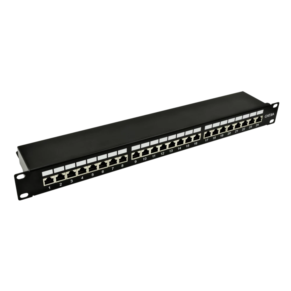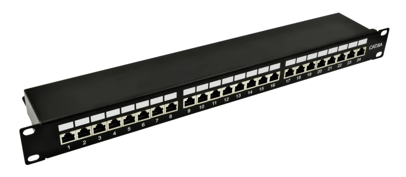 PULSAR RP-F24V5 19" patch panel; 24 port; cat5e; árnyékolt; tehermentesítővel; 90 fokos modulok