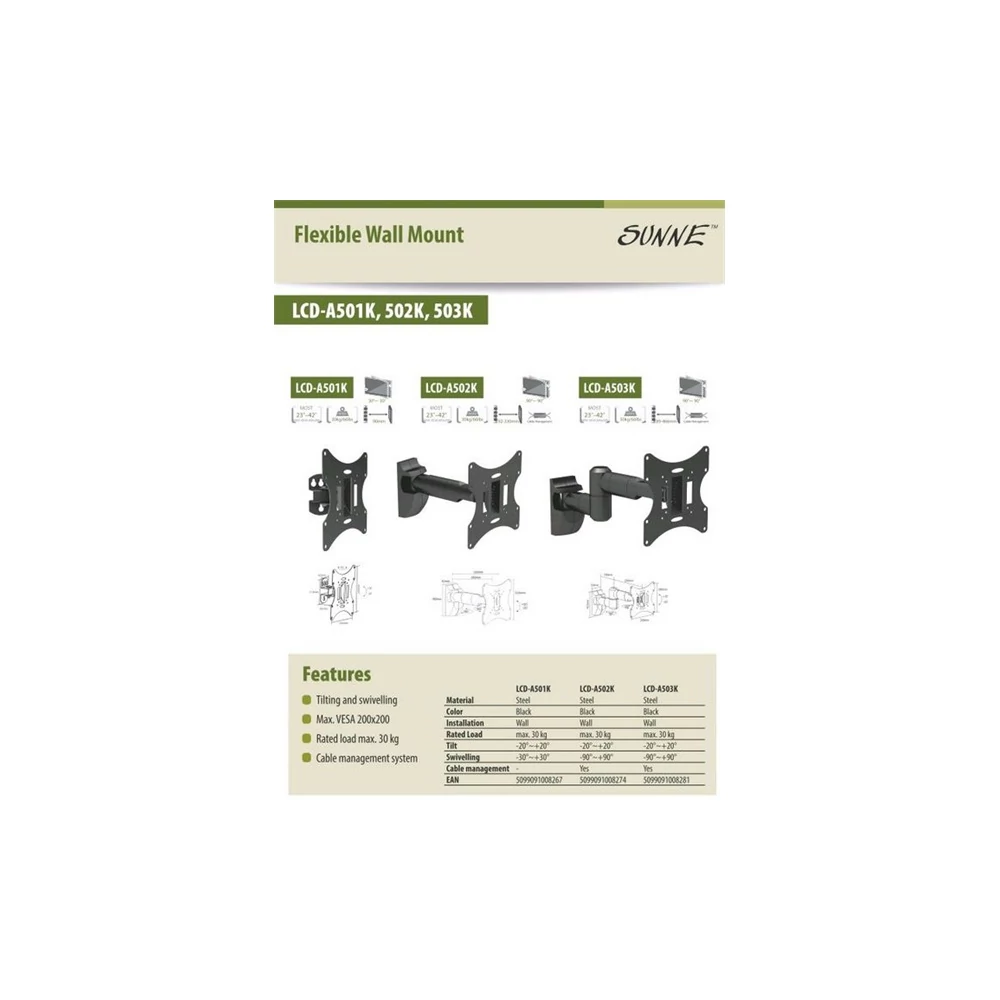 SUNNE LCD-A501K Monitor fali konzol dönthető, forgatható, 23-42", faltáv: